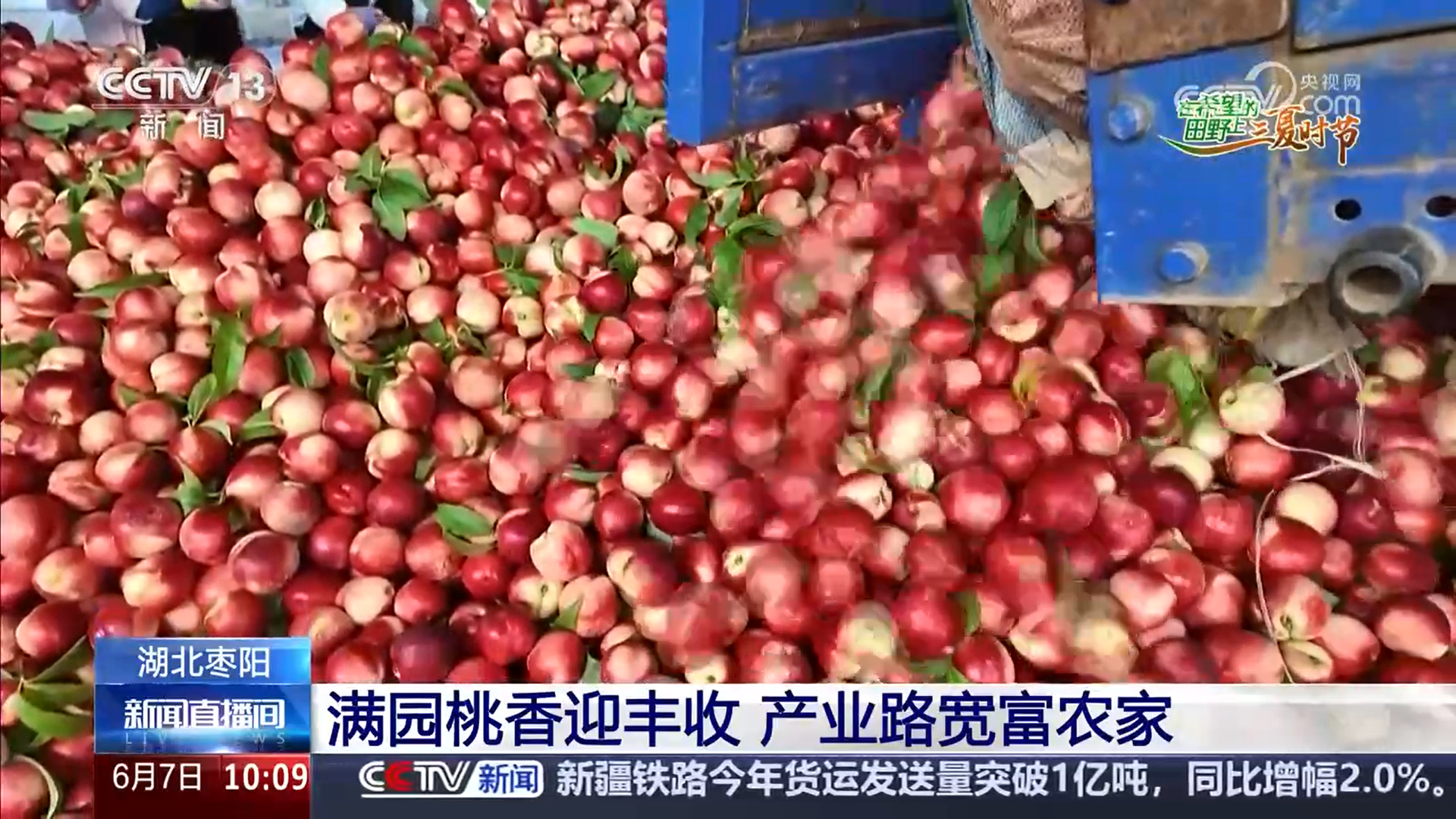 央视网消息: 近日,湖北枣阳市的35万亩桃林陆续迎来丰收,目前油桃、黄桃等品种正集中上市,工人们忙着采摘、分拣,收购商们则等着挑选,产销两旺。