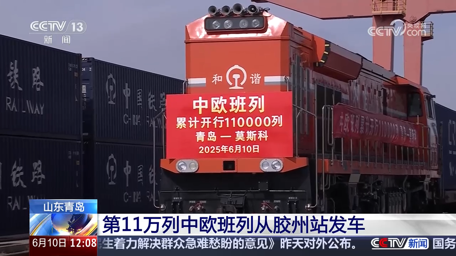 央视网消息:6月10日上午,满载智能家电的75052次中欧班列从青岛胶州站发车,中欧班列累计开行数量突破11万列,发送货值超4500亿美元。来看总台记者从现场发回的报道。
