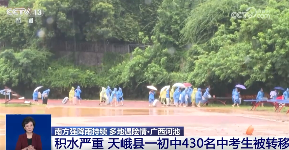 央视网消息: 6月22日,广西河池市天峨县因持续强降雨引发洪水倒灌,导致城区多处严重积水。天峨县民族中学因积水严重,校内即将参加中考的430名学生被围困在宿舍楼。来看总台记者23日中午从民族中学发回的报道。