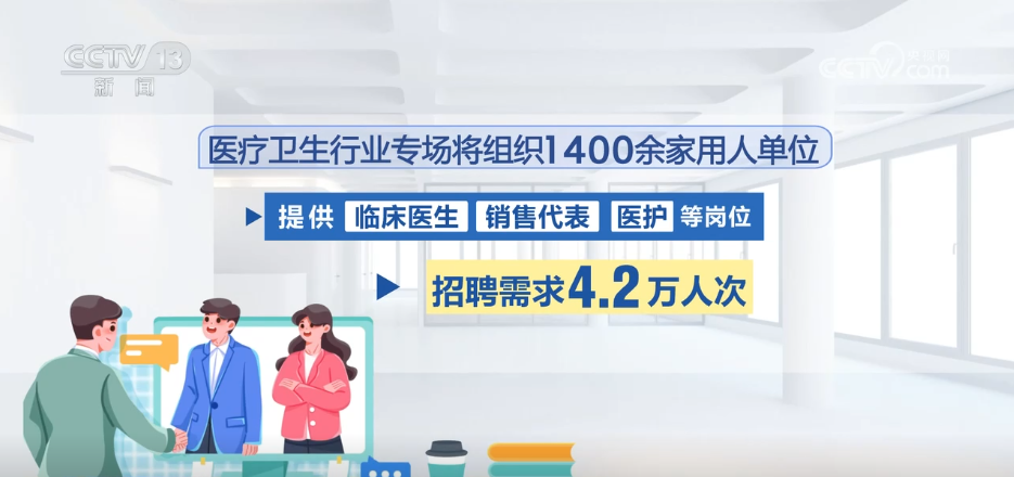 医疗卫生行业专场将组织1400余家用人单位,提供临床医生、销售代表、医护等岗位,招聘需求4.2万人次。