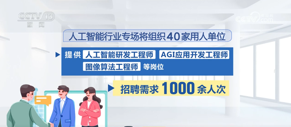 人工智能行业专场将组织40家用人单位,提供人工智能研发工程师、AGI应用开发工程师、图像算法工程师等岗位,招聘需求1000余人次。