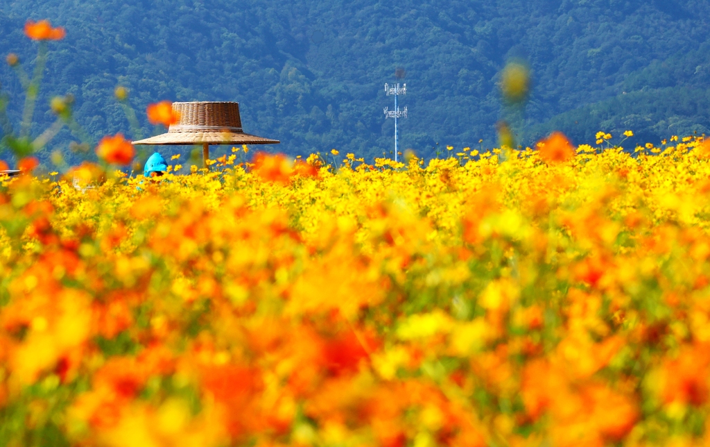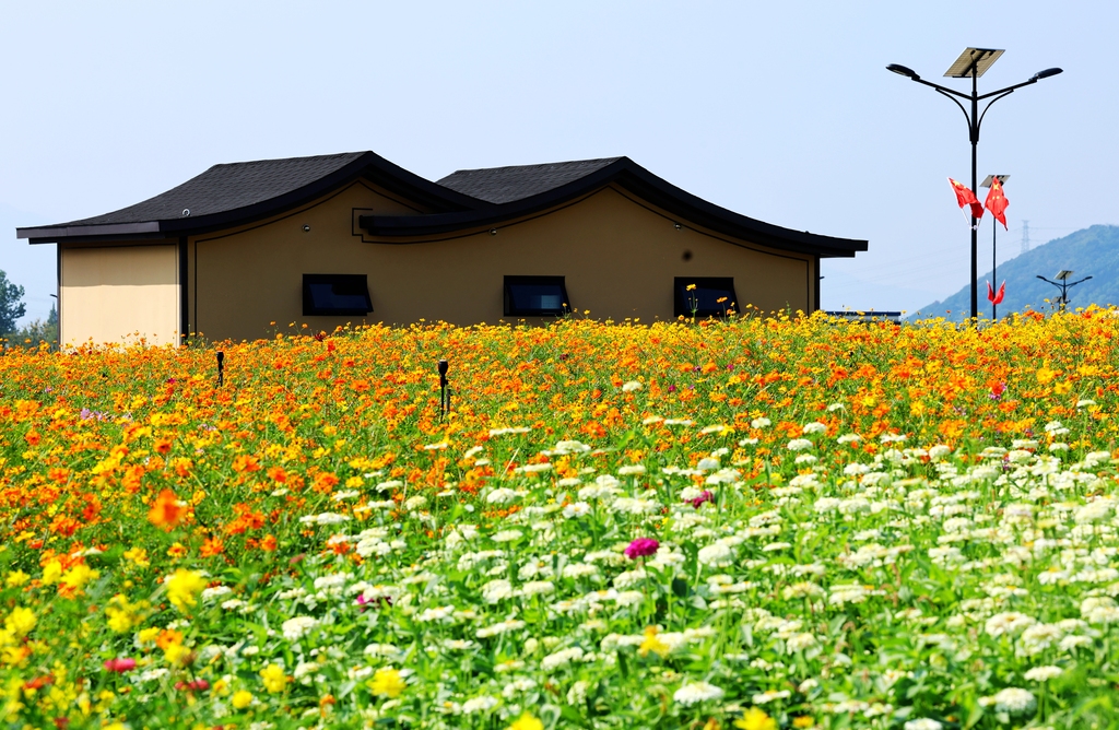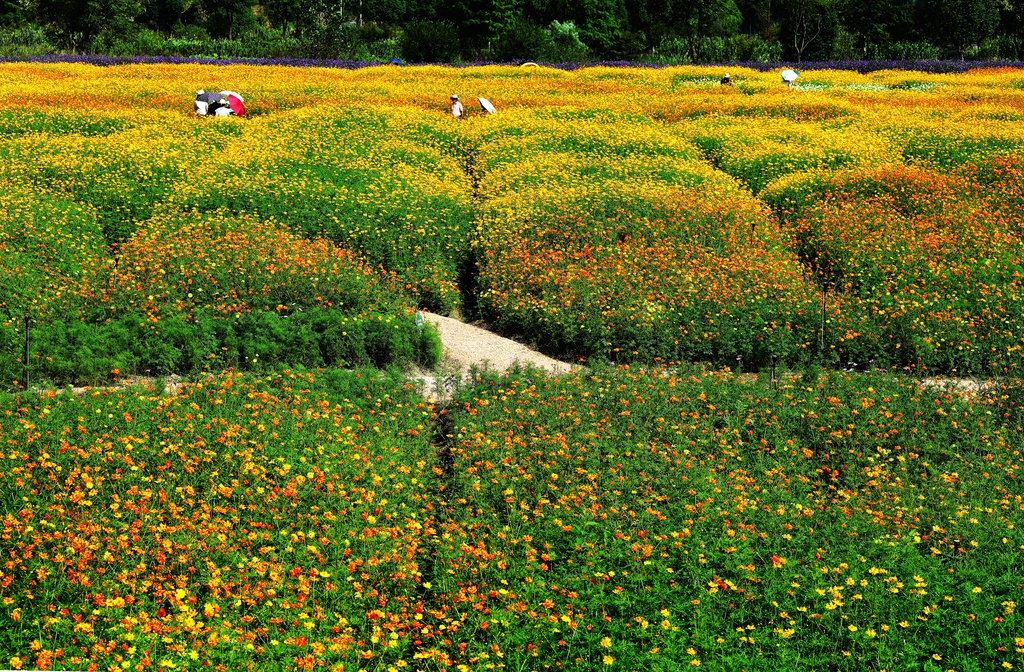 2025年10月2日,秋天的铜鉴湖花海美如画,大片花海尤如童话般的世界。波斯菊、向日葵、千日红、香彩雀等各种花,为铜鉴湖披上了五彩斑斓的外衣。视觉中国