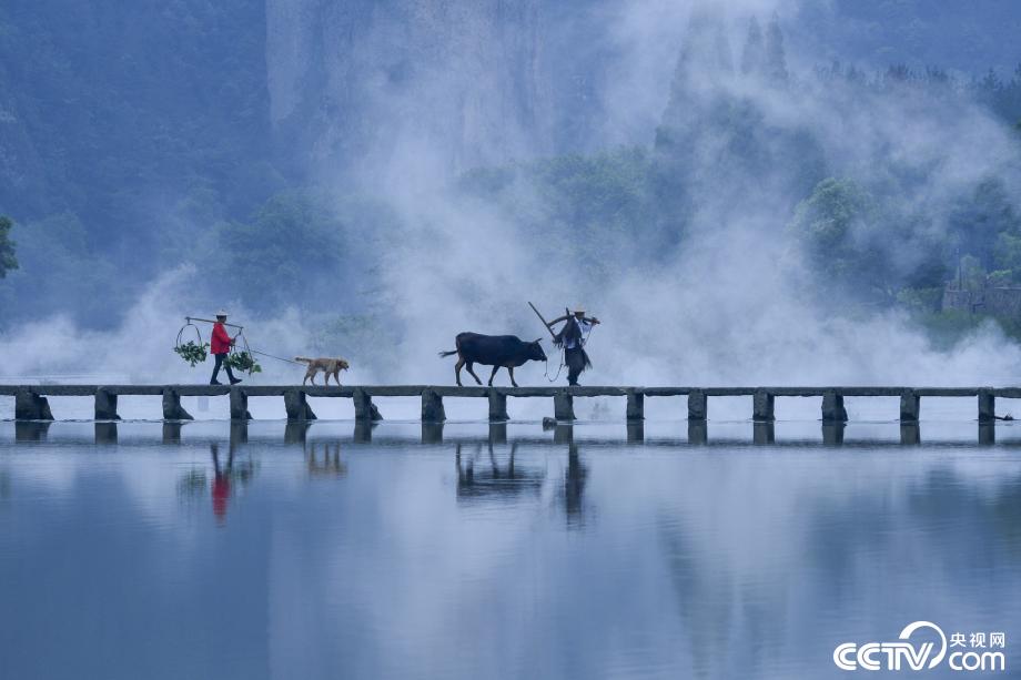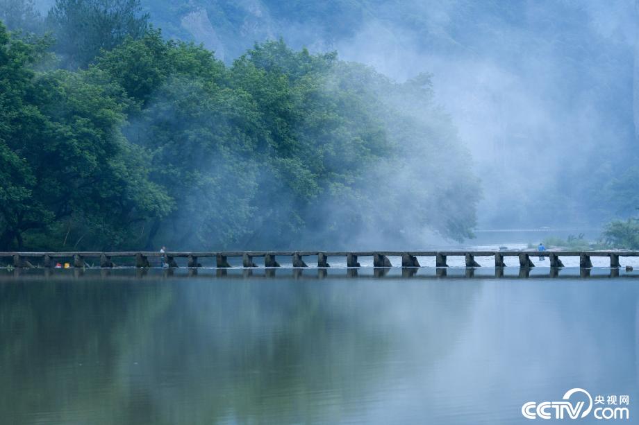 浙江丽水,清晨的缙云仙都河水云雾缭绕,人们从露出水面的石桥上走过,好似画中游。视觉中国