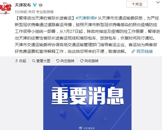 【暂停进出天津的省际长途客运】#天津新闻# 从天津市交通运输委获悉,为严控新型冠状病毒通过道路客运传播,按照天津市新型冠状病毒感染的肺炎疫情防控工作领导小组统一部署,从1月27日起,除政府指定及疫情防控工作需要,暂停进出天津的经营性省际长途客运班线和省际包车、旅游包车,恢复时间另行通知。天津市交通运输委将协调各地交通运输管理部门指导客运企业、客运站为乘客做好免费退票和宣传解释工作,由此给您带来的不便,敬请谅解。