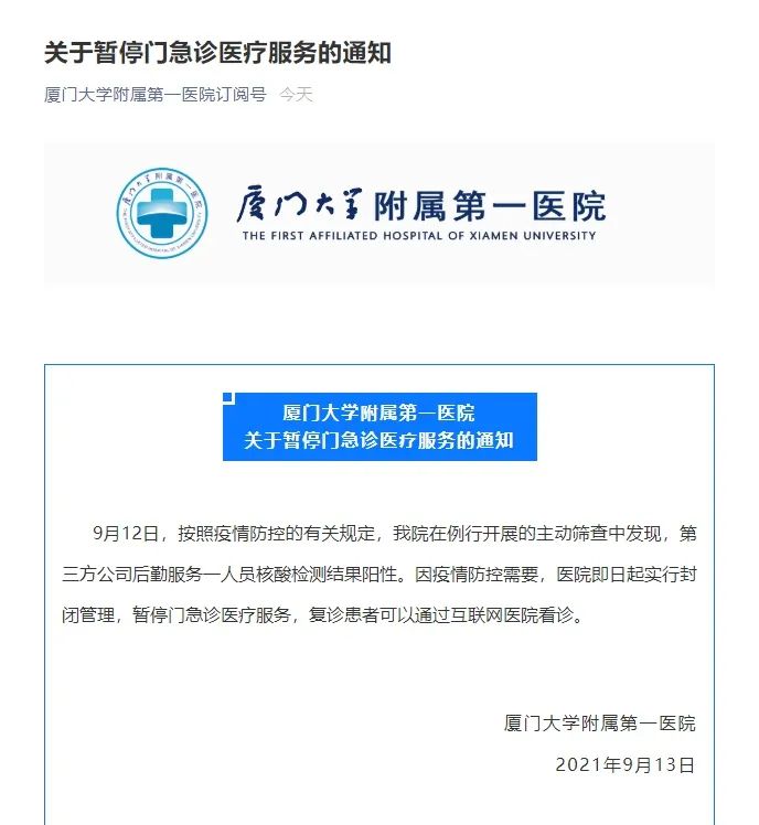 9月12日,厦门大学附属第一医院在例行开展的主动筛查中发现,第三方公司后勤服务一人员核酸检测结果阳性。因疫情防控需要,医院即日起实行封闭管理,暂停门急诊医疗服务,复诊患者可以通过互联网医院看诊。