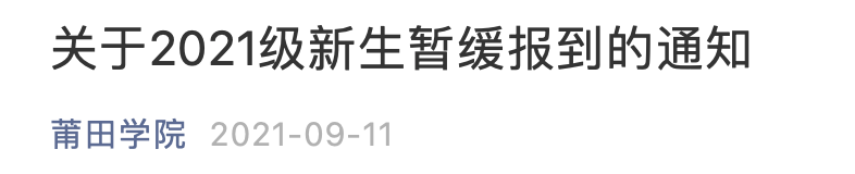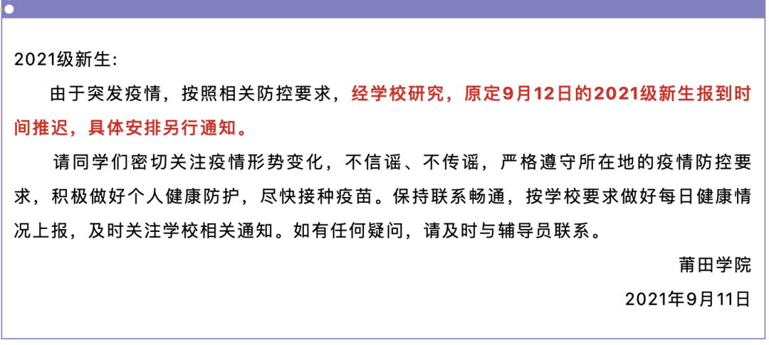 针对莆田目前的突发疫情形势,11日,福建莆田学院紧急发布告新生通知,原定9月12日2021级新生开学报到,时间推迟。具体安排另行通知。
