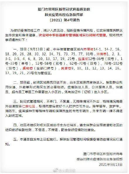 9月13日,厦门市思明区新型冠状病毒感染的肺炎疫情防控应急指挥部通告:决定对中华街道部分管辖区域实行封闭式管理。封闭区域居民只进不出,非本区域居民谢绝进入。