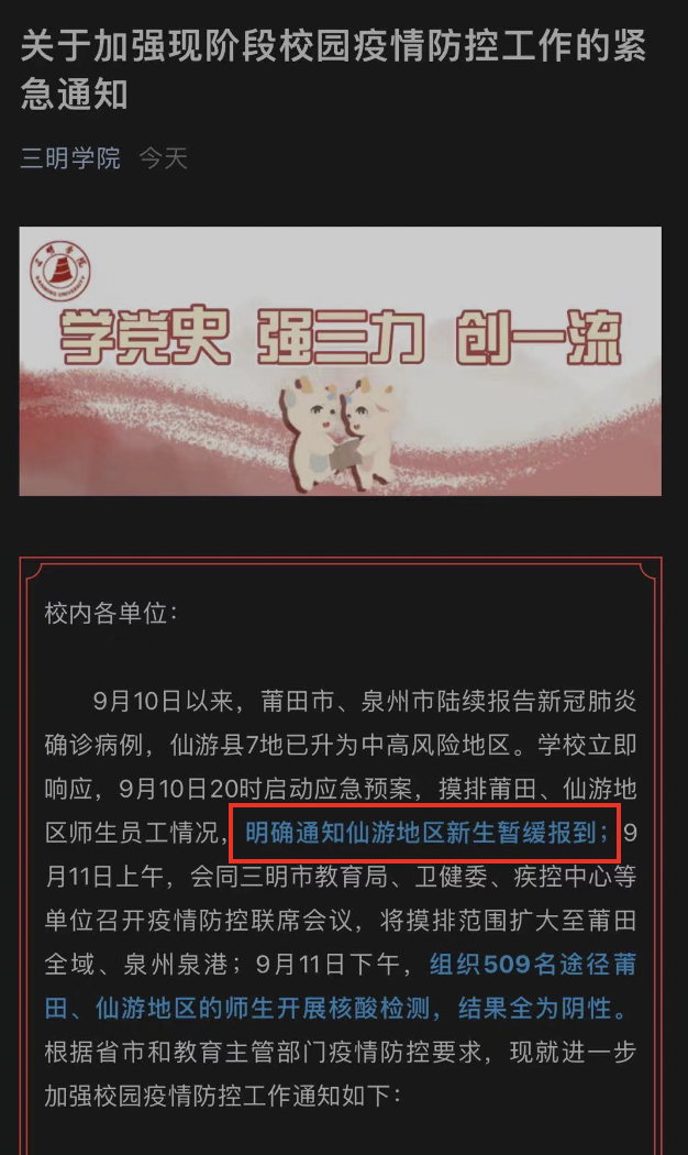 9月12日,三明学院发布关于加强现阶段校园疫情防控工作的紧急通知,明确:仙游地区新生暂缓报到。