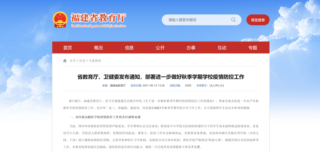 9月12日,福建省教育厅、省卫生健康委员会联合印发《关于进一步做好秋季学期学校疫情防控工作的通知》,各级各类学校原则上在9月19日前组织全体师生员工完成新一轮核酸检测工作。