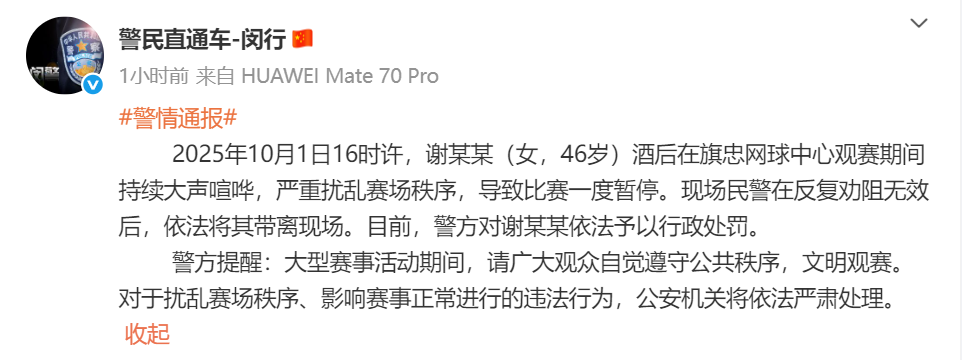 上海警方通报:一女子在旗忠网球中心观赛期间持续大声喧哗,依法对其行政处罚