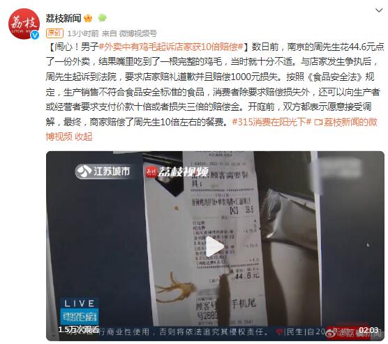 数日前,南京的周先生花44.6元点了一份外卖,结果嘴里吃到了一根完整的鸡毛,当时就十分不适。与店家发生争执后,周先生起诉到法院,要求店家赔礼道歉并且赔偿1000元损失。按照《食品安全法》规定,生产销售不符合食品安全标准的食品,消费者除要求赔偿损失外,还可以向生产者或经营者要求支付价款十倍或者损失三倍的赔偿金。开庭前,双方都表示愿意接受调解,最终,商家赔偿了周先生10倍左右的餐费。