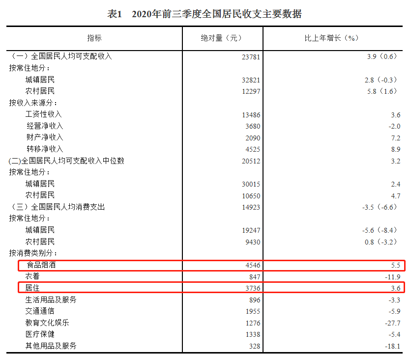 国家统计局提供数据显示,2020年前三季度食品烟酒和居住支出占比合计达55.5%,是国内居民最重要的两项消费支出,同时也是八大类别消费支出中,唯二的两项保持正常增长的消费支出。