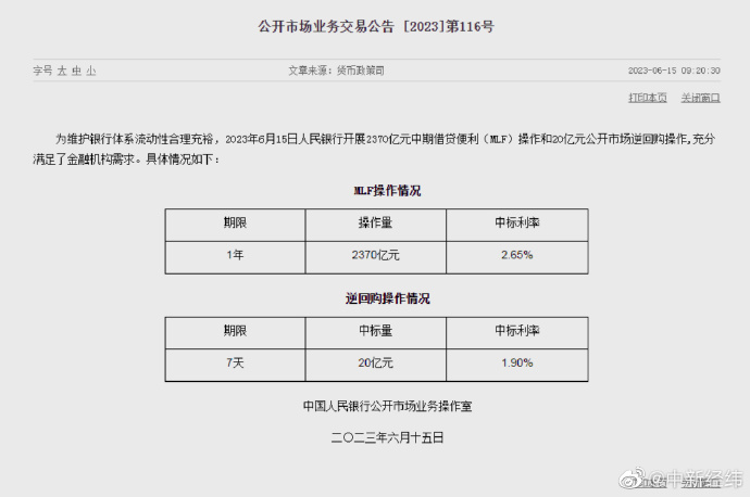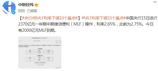中国央行15日进行2370亿元一年期中期借贷便利(MLF)操作,利率2.65%,此前为2.75%。今日有2000亿元MLF到期。