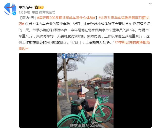北京共享单车运维员最高月薪过万背后:体力与专业的双重考验。近日,中新经纬小编体验了当青桔单车“路面运维员”的一天。带领小编的朱师傅55岁,今年是他在北京做共享单车运维员的第5年。每辆单车重40斤,朱师傅平均一天要调度约200辆。朱师傅说,工作以来他至少减重10斤,这份工作能在健身的同时把钱赚了。“好好干,工资能有万把块。”