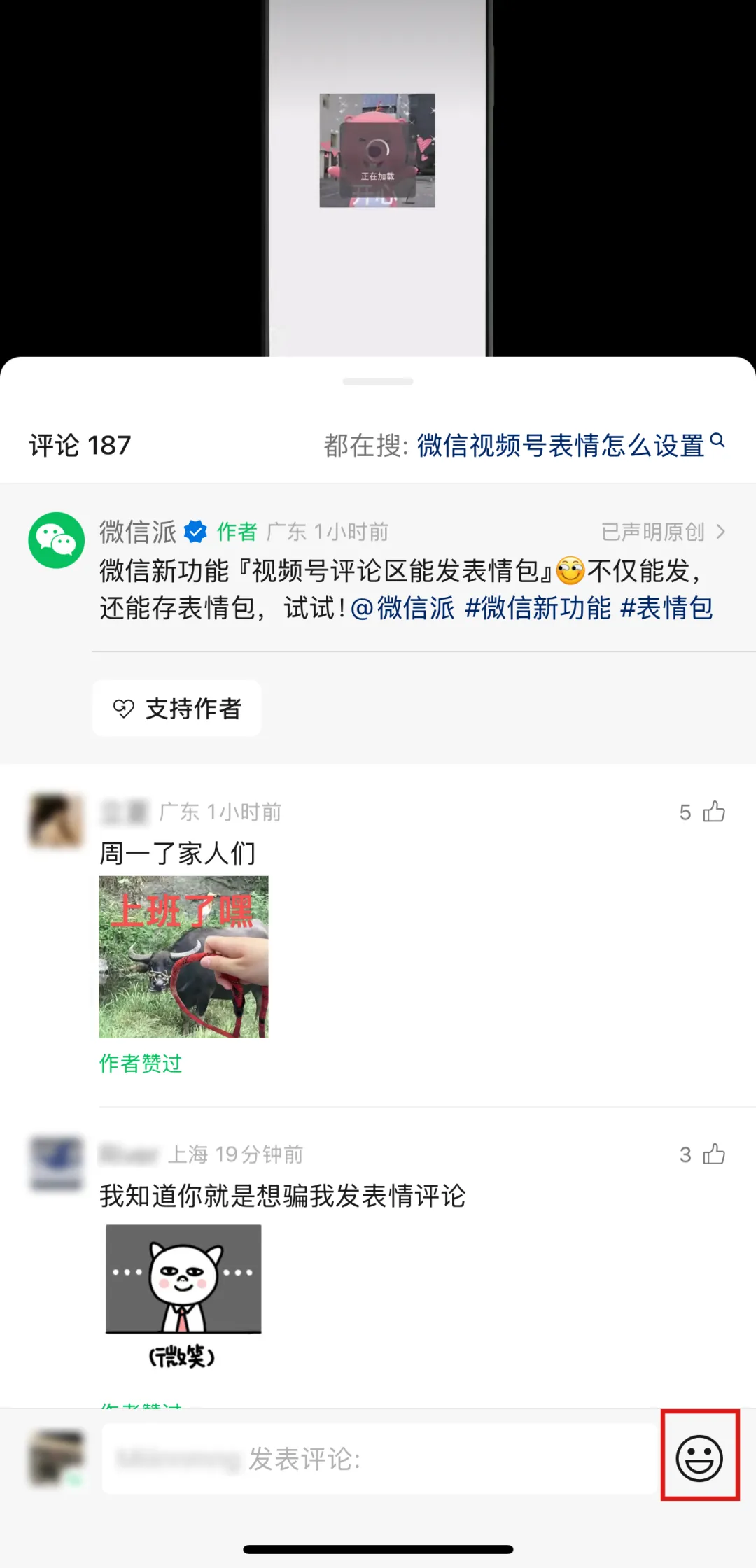 据微信派官方公众号消息,微信视频号评论区可以发表情包了,具体操作如下: