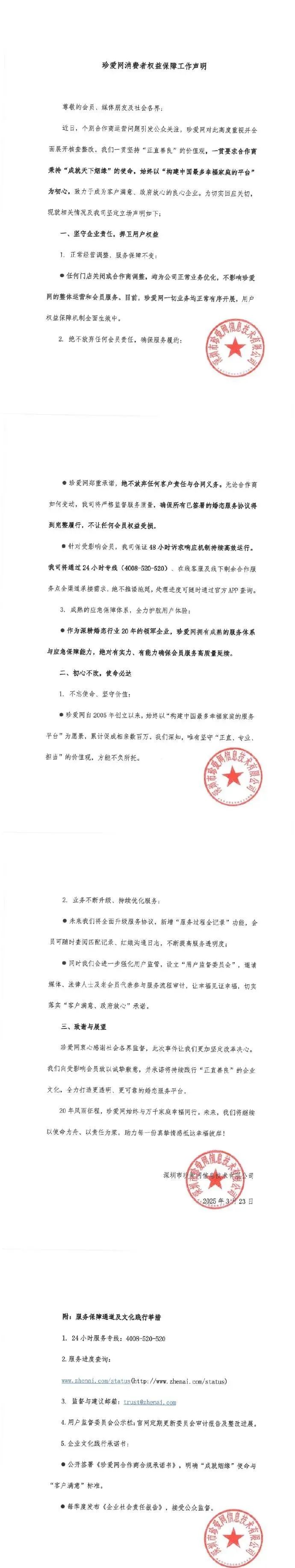 珍爱网称,任何门店关闭或合作商调整,均为公司正常业务优化,不影响珍爱网的整体运营和会员服务。目前,珍爱网一切业务均正常有序展开,用户权益保障机制全面生效中。