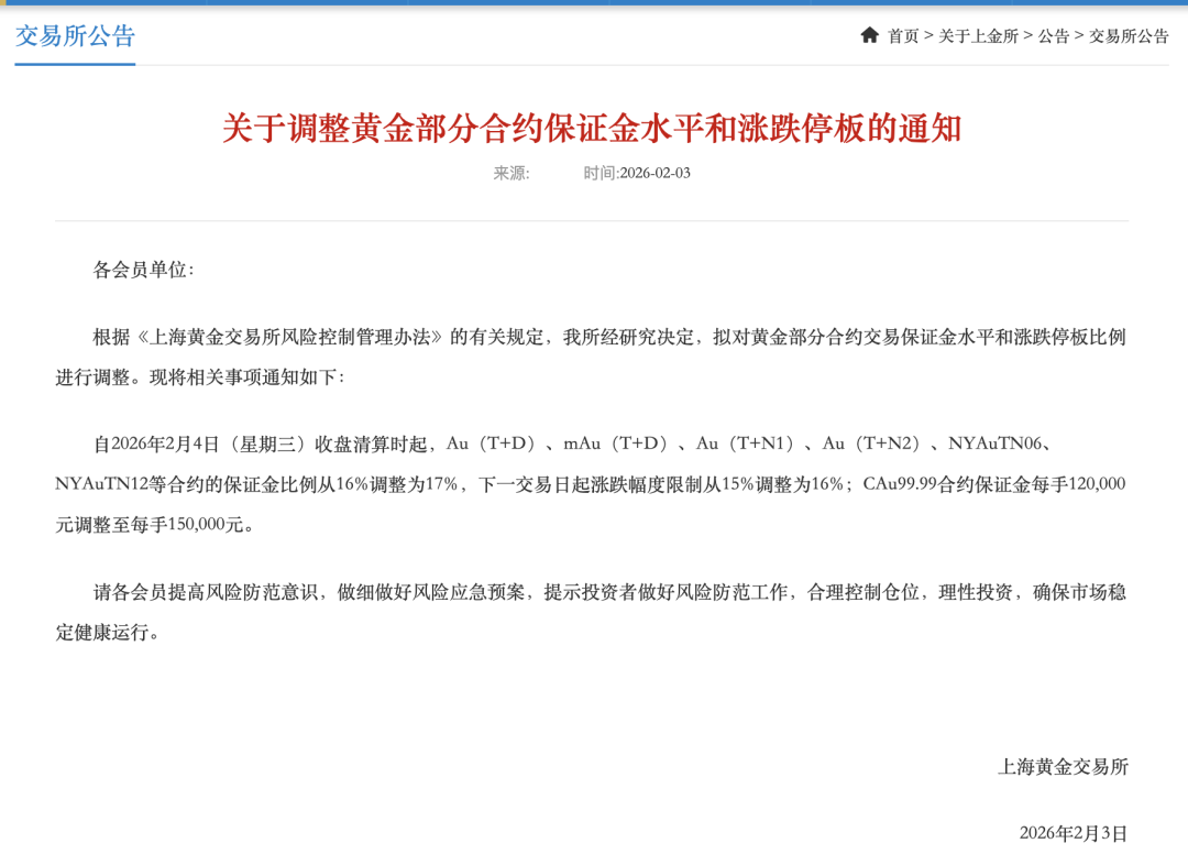 自2026年2月4日(星期三)收盘清算时起,Au(T+D)、mAu(T+D)、Au(T+N1)、Au(T+N2)、NYAuTN06、NYAuTN12等合约的保证金比例从16%调整为17%,下一交易日起涨跌幅度限制从15%调整为16%;CAu99.99合约保证金每手120,000元调整至每手150,000元。