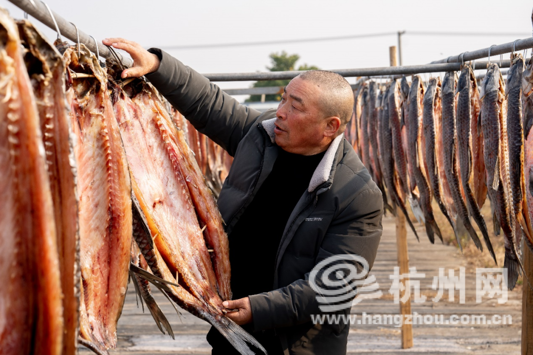 12月18日,杭州网记者走进杭州余杭仁和街道的三白潭村,农户家鱼塘边上正晒着一排排青鱼干,微风来时,像芭蕉叶一般轻轻摇晃。青鱼干破开肚的一面朝着阳光,鱼肉渗出点点油,透出红色光泽来。