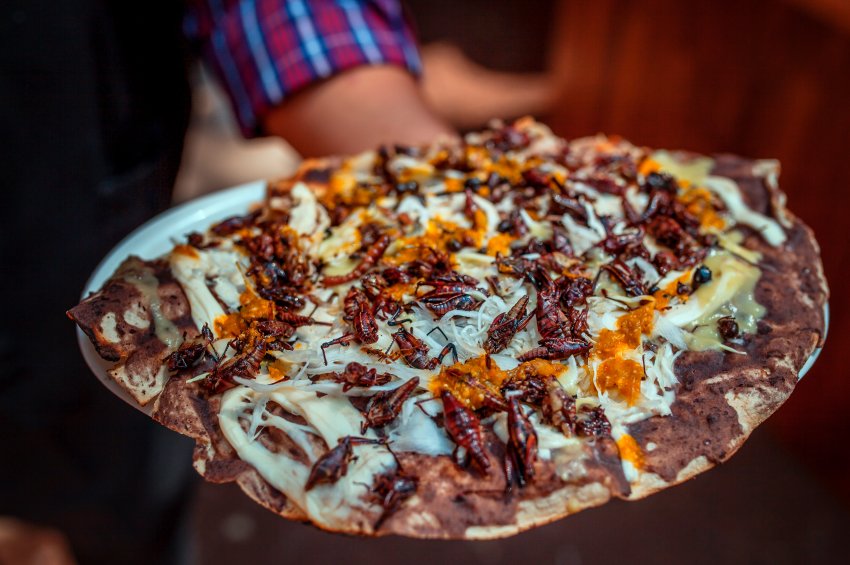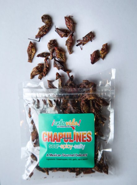 这份墨西哥玉米饼上有好多只蝗虫。制作过程:将蝗虫洗净,烤熟,加入大蒜、柠檬汁和盐腌制。成品:令人难以置信的松脆可口!