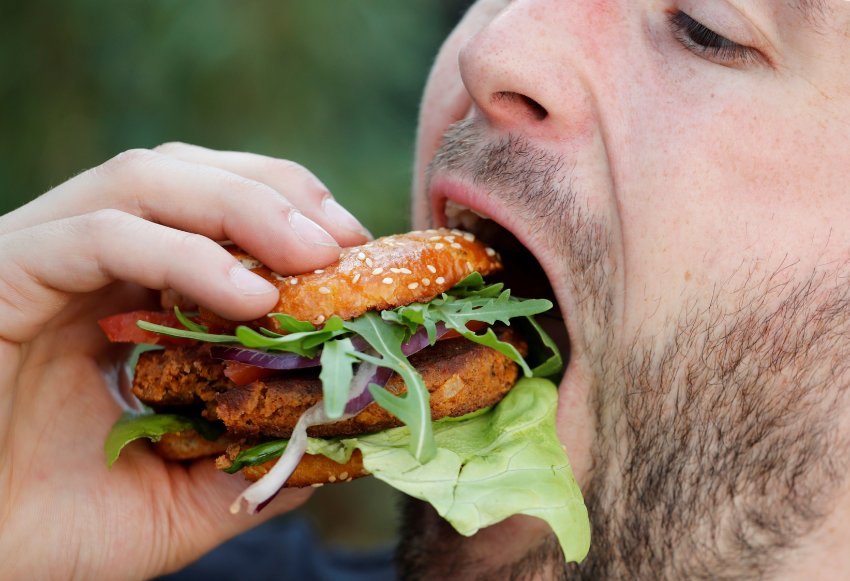 公司创始人之一马克思·克雷默正在吃一个水牛蠕虫汉堡。产品宣传承诺“优质蛋白”和“百分百无添加”。