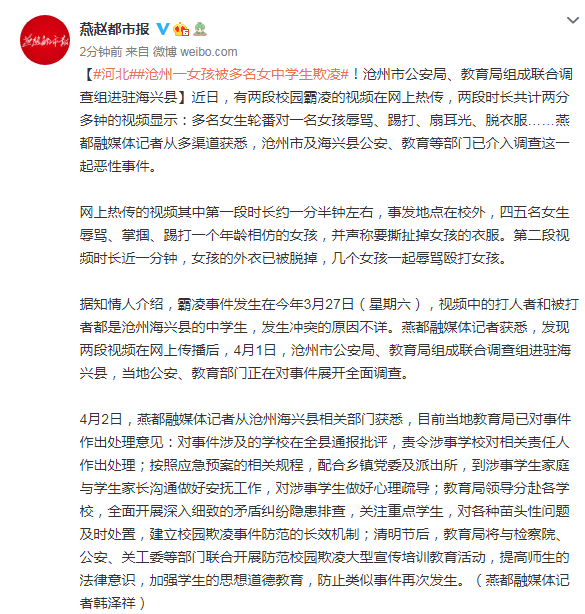 沧州一女孩被多名女中学生欺凌,沧州市公安局、教育局组成联合调查组进驻海兴县