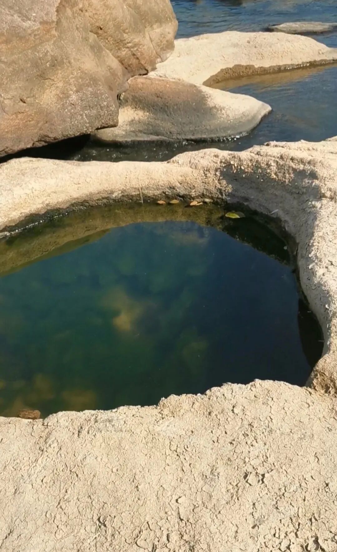 最先发现奇观的是当地“黄腊石迷”曾武军。当天,他循例到库区寻石,却在干涸的库底深处看到近百平方米的特殊岩石:密密麻麻的凹坑呈圆或椭圆形,直径十几厘米到一米多,深可达数十厘米,内壁光滑,水流冲刷痕迹明显。“以前全在水下,谁也没想到藏着这么奇特的地貌。”曾武军说。