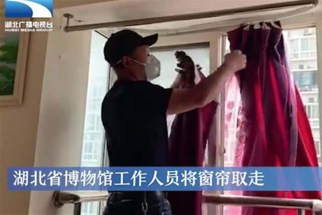 今日上午,湖北省博物馆的工作人员来到窗帘主人王先生的家里,将这条酒红色的窗帘拆下,并量了窗户尺寸,将赠送给王先生一条新窗帘。博物馆工作人员还给王先生开具了收藏证明,待窗帘在省博馆展出时,王先生还将收到正式的收藏证书。