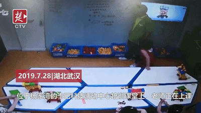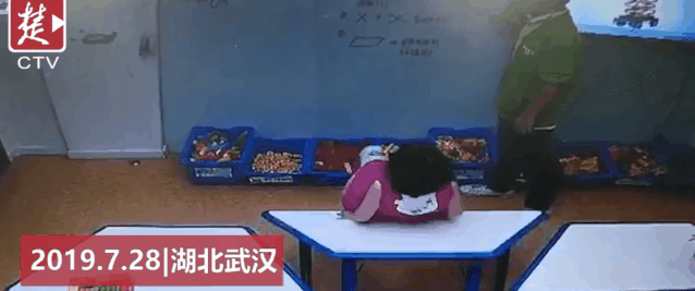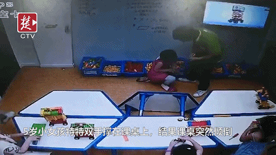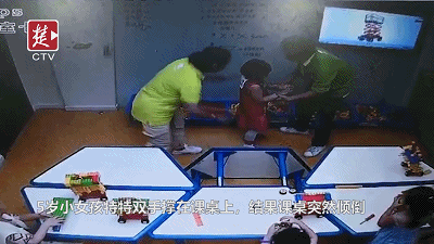 桌子会什么会倒?监控视频显示,教室内一共有6张课桌拼在一起,4个小朋友靠课桌边坐着,一名老师正在写字板前讲解,还有一名老师守在教室一角。