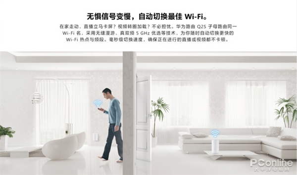 华为路由Q2S还支持真双频与无缝漫游创新技术,仅需1次连接,即可自动切换更好的Wi-Fi频段与热点。