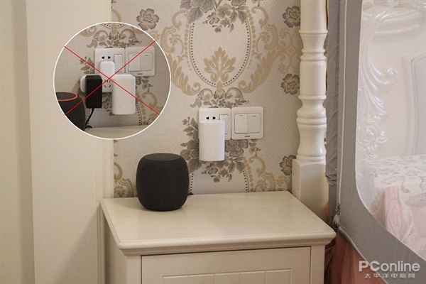 此外主卧还有华为AI音箱等IoT设备,将子路由放在这里最实用。另外官方不建议使用插线板,因为部分插线板有滤波功能,会导致子路由无法上网。