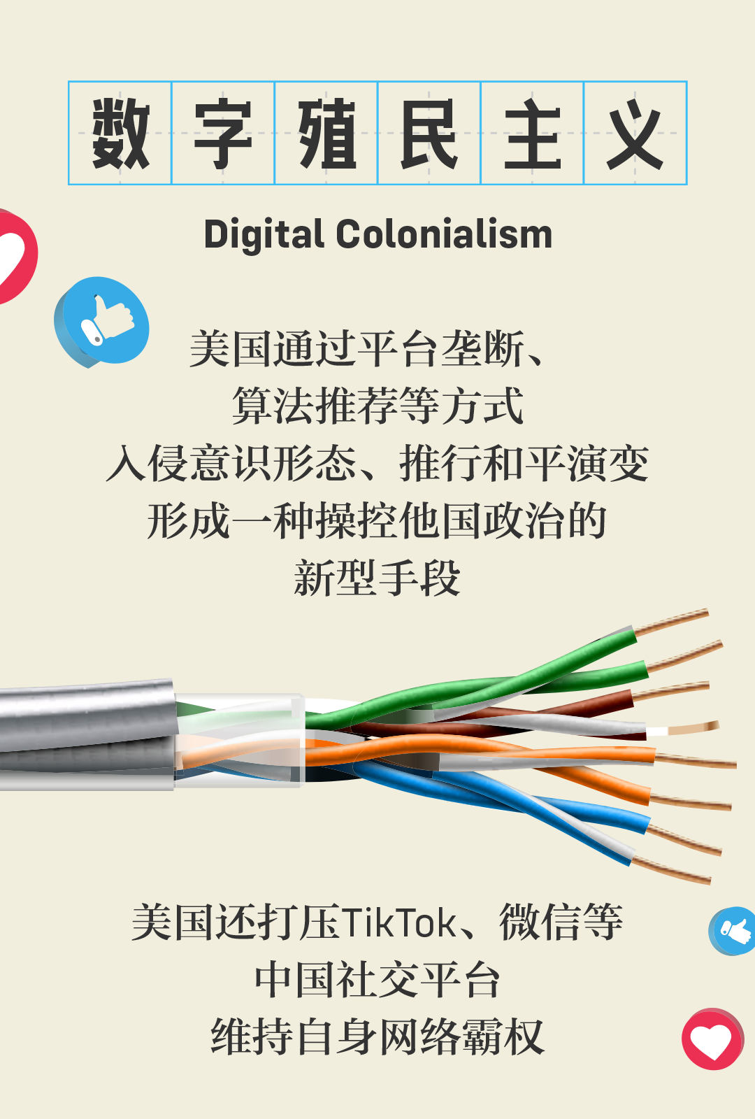 美国通过平台垄断、算法推荐等方式,入侵意识形态、推行和平演变,形成一种操控他国政治的新型手段。美国还打压TikTok、微信等中国社交平台,维持自身网络霸权。