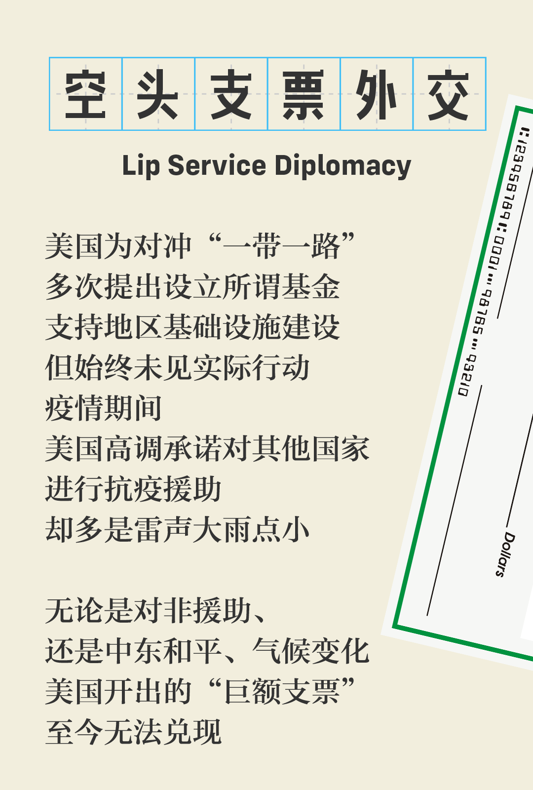 美国为对冲“一带一路”,多次提出设立所谓基金,支持地区基础设施建设,但始终未见实际行动。疫情期间,美国高调承诺对其他国家进行抗疫援助,却多是雷声大雨点小。此外,无论是对非援助、还是中东和平、气候变化,美国开出的“巨额支票”至今仍是一张张白纸。
