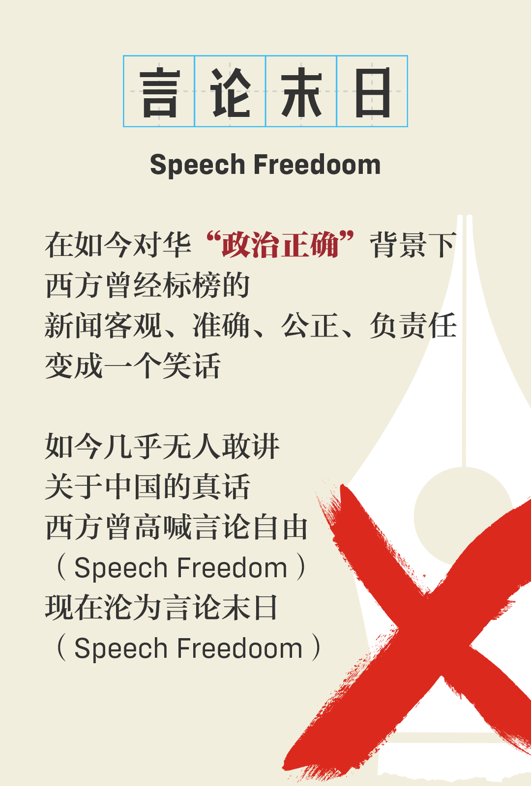 在如今对华“政治正确”的背景下,西方曾经标榜的新闻客观、准确、公正、负责任,变成一个笑话。如今几乎无人敢讲关于中国的真话,西方曾高喊言论自由(Speech Freedom),现在沦为言论末日(Speech Freedoom)。