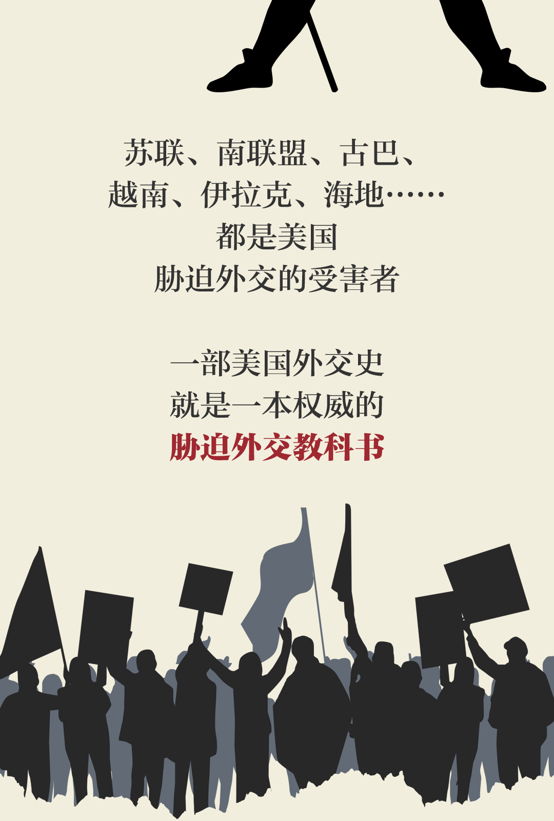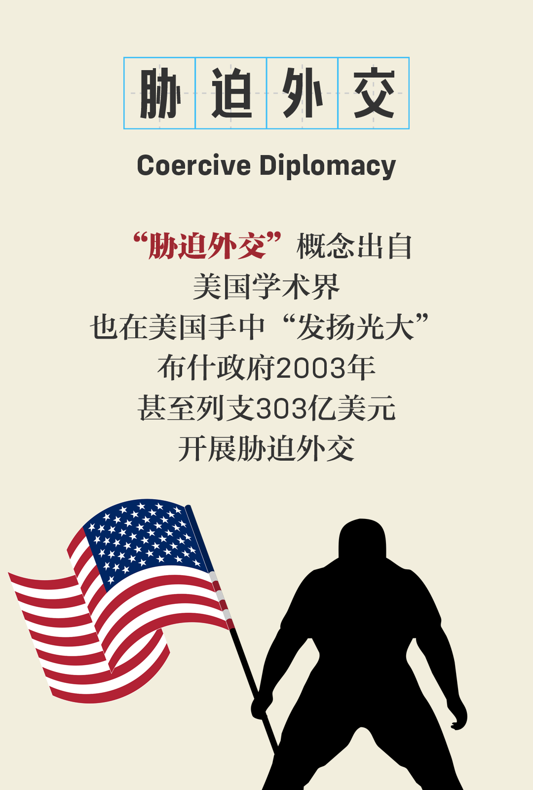 “胁迫外交”概念出自美国学术界,也在美国手中发扬光大。布什政府2003年甚至列支303亿美元开展胁迫外交,苏联、南联盟、古巴、越南、伊拉克、海地……都是美国胁迫外交的受害者。一部美国外交史,就是权威的胁迫外交教科书。