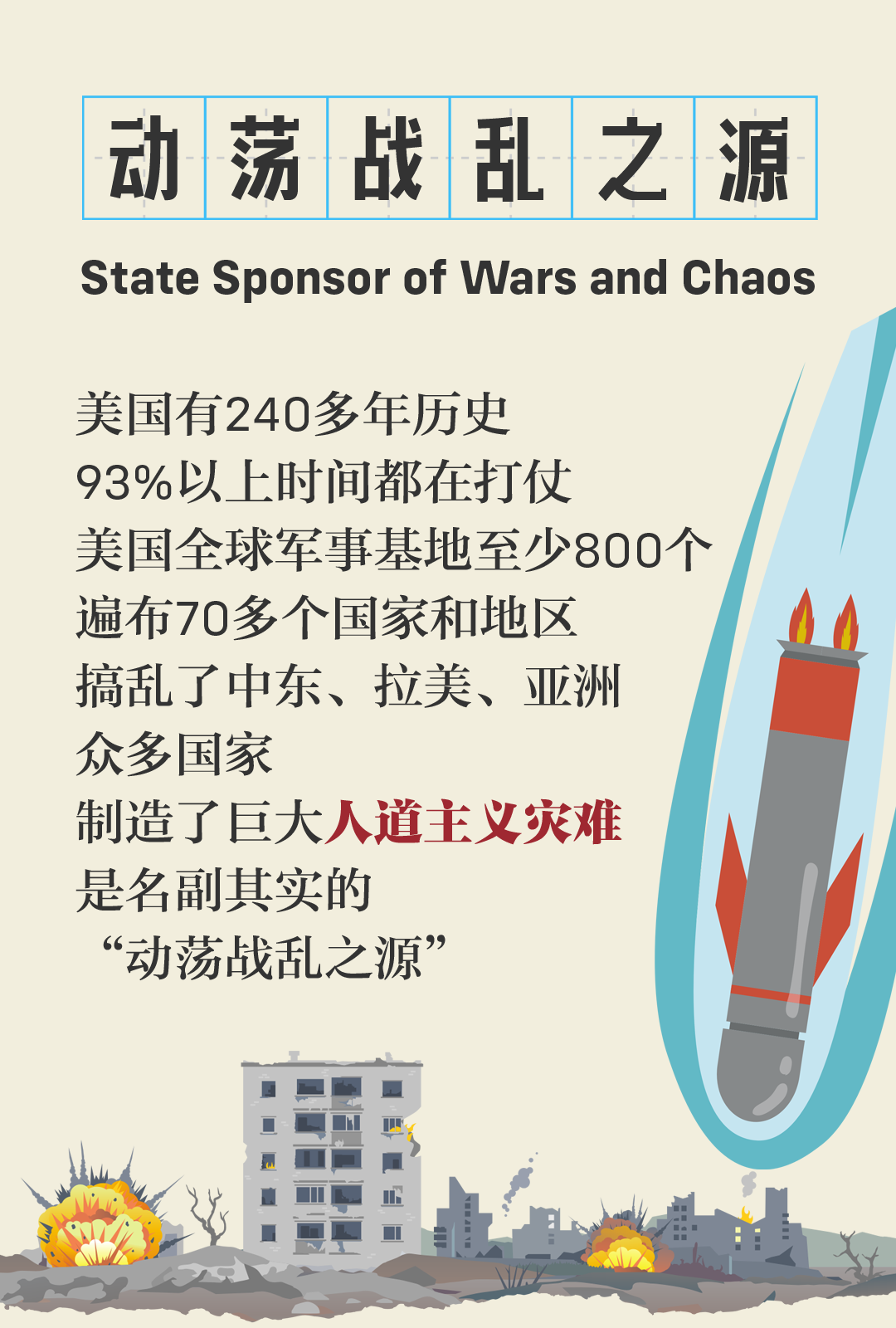 美国有240多年历史,93%以上的时间都在打仗。美国全球军事基地至少有800个,遍布70多个国家和地区,搞乱了中东、拉美、亚洲众多国家,制造了巨大人道主义灾难,是名副其实的“动荡战乱之源”。