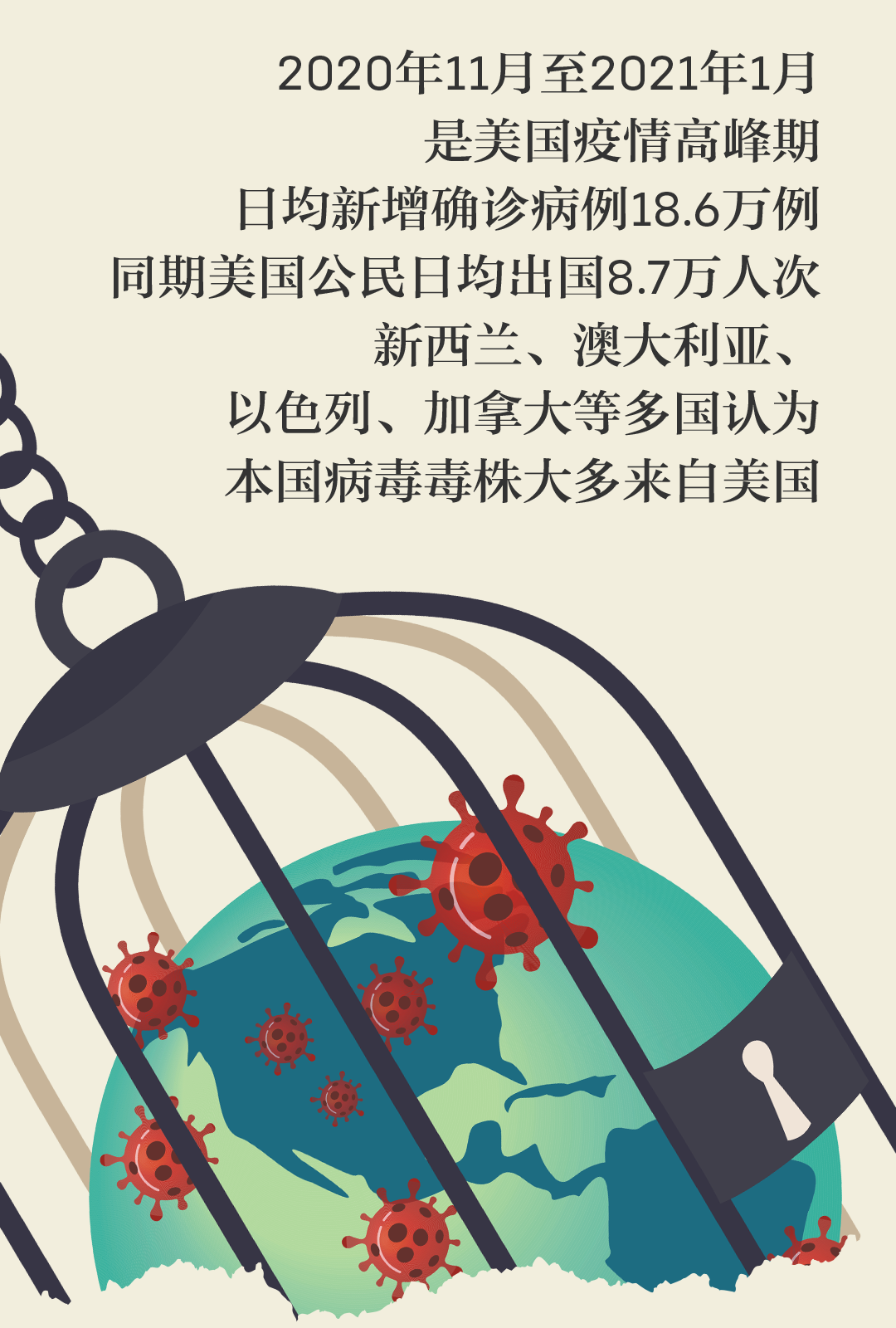 大疫当前,美国不仅对内防控不力,对人员出境更是管控松懈。根据美国国家旅游办公室发布的数据,2020年4月至2021年3月,美国公民累计经空港、陆地出国2319.5万人次。2020年11月至2021年1月系美国疫情高峰期,日均新增确诊病例18.6万例,同期美国公民日均出国8.7万人次。新西兰、澳大利亚、以色列、加拿大等多国认为,本国病毒毒株大多来自美国。