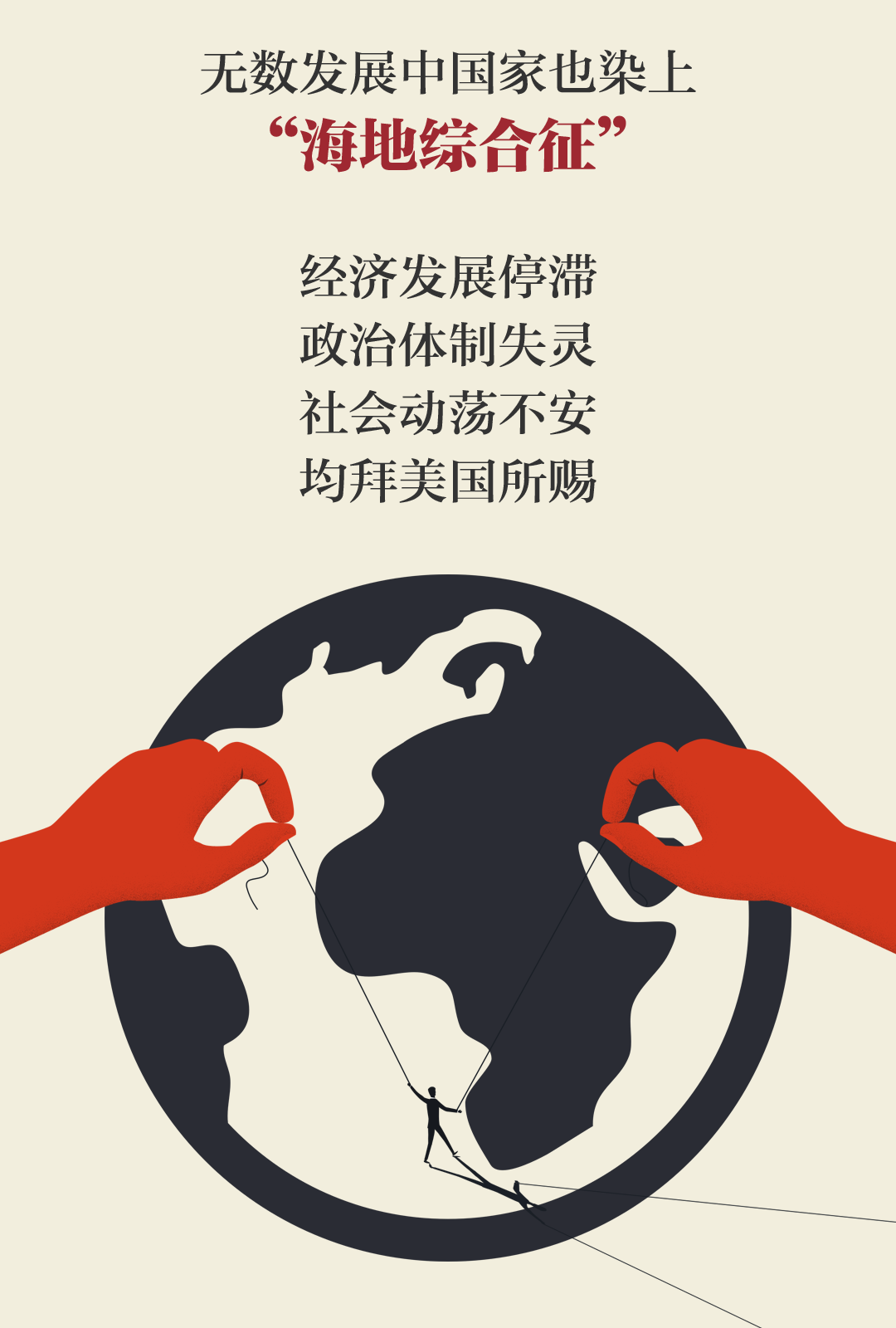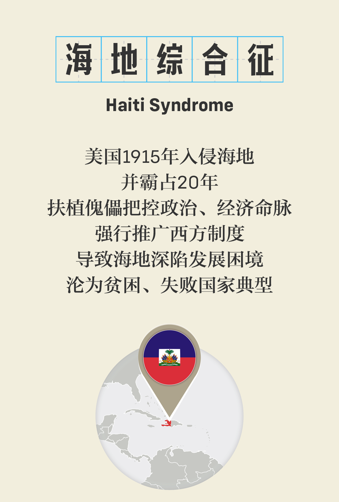 美国1915年入侵海地并霸占20年,扶植傀儡把控政治、经济命脉,强行推广西方制度,导致海地深陷发展困境,沦为贫困、失败国家典型。无数发展中国家也染上“海地综合征”,经济发展停滞、政治体制不顺、社会动荡不安,均拜美国所赐。