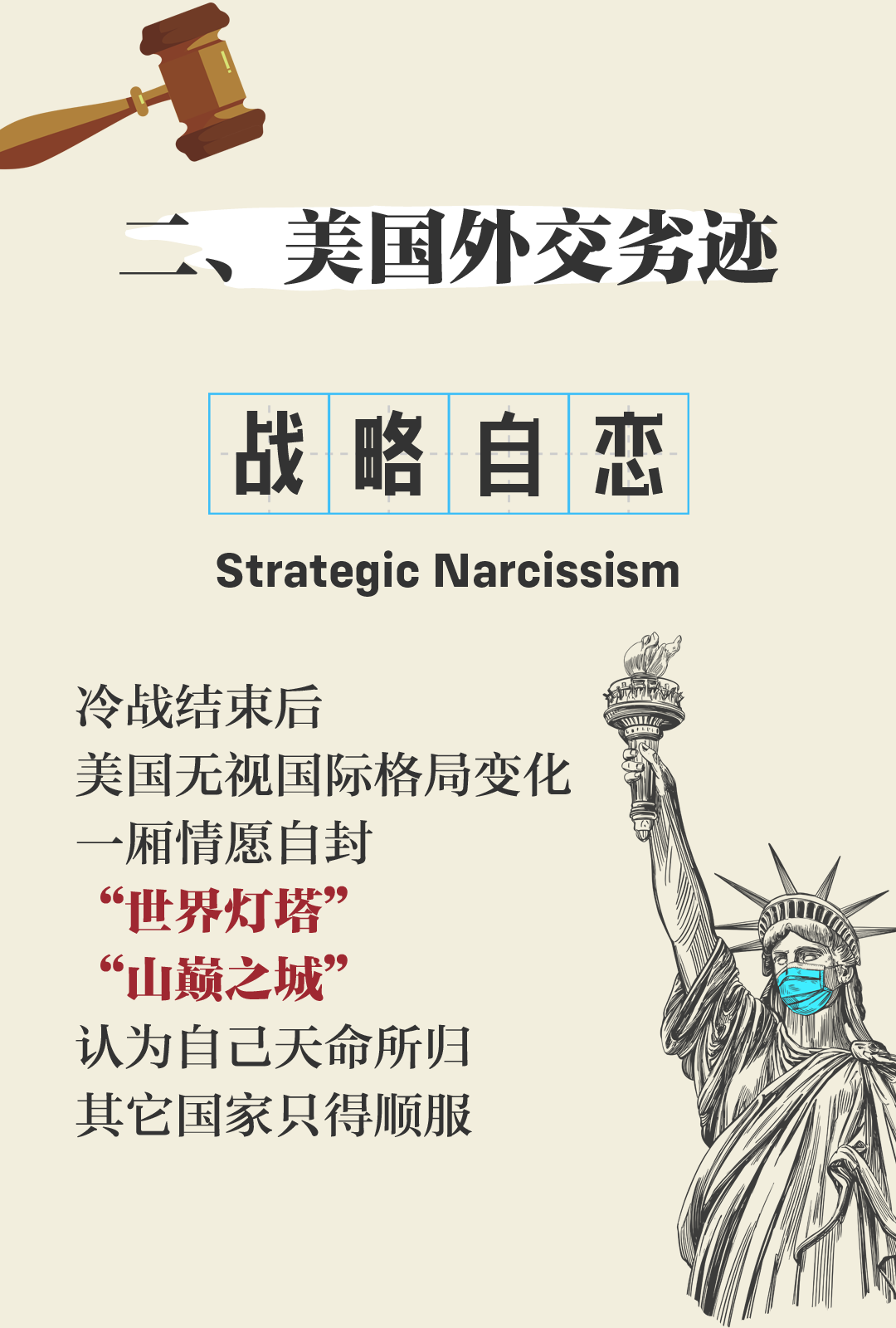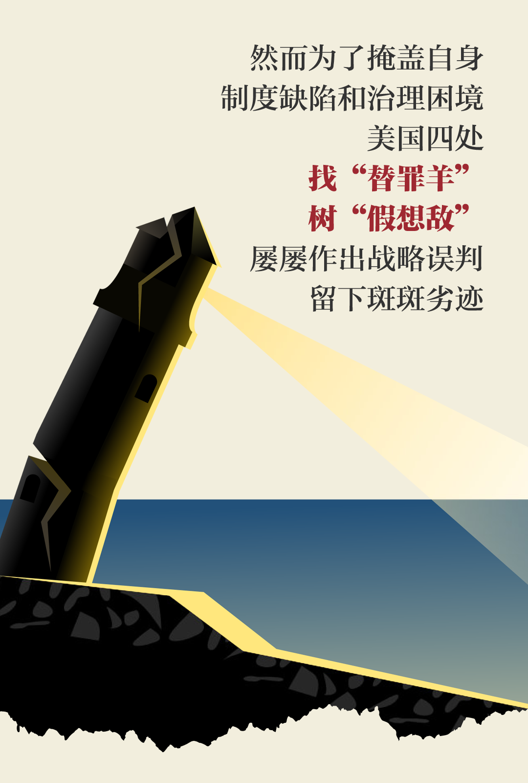 冷战结束后,美国无视国际格局变化,一厢情愿自封“世界灯塔”“山巅之城”,认为自己天命所归,其它国家只得顺服。然而为了掩盖自身制度缺陷和治理困境,美国四处找“替罪羊”、树“假想敌”,屡屡作出战略误判,留下斑斑劣迹。