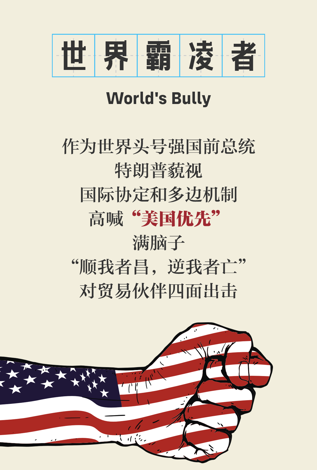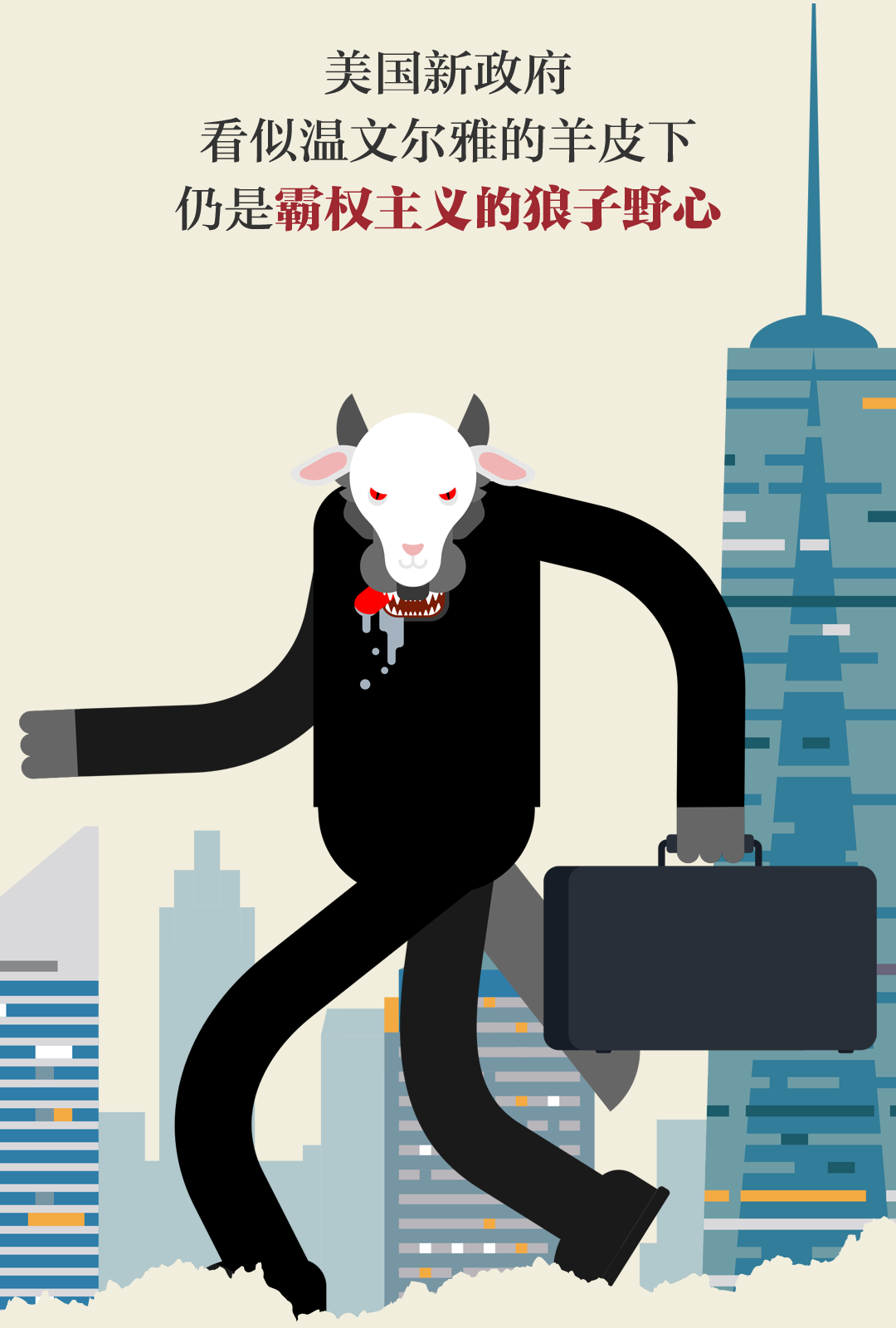 作为世界头号强国的前总统,特朗普藐视国际协定和多边机制,高喊“美国优先”,满脑子“顺我者昌,逆我者亡”,对贸易伙伴四面出击。美国新政府看似温文尔雅的羊皮下,仍是霸权主义的狼子野心。