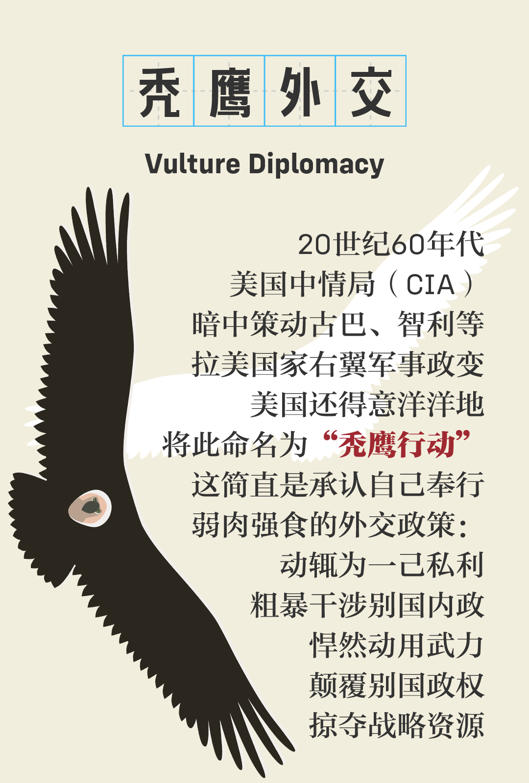 20世纪60年代,美国中情局(CIA)暗中策动古巴、智利等拉美国家右翼军事政变。美国还得意洋洋地将有关行动命名为“秃鹰行动”,这简直是承认自己奉行弱肉强食的外交政策:动辄为一己私利粗暴干涉别国内政,悍然动用武力颠覆别国政权,粗暴掠夺战略资源。