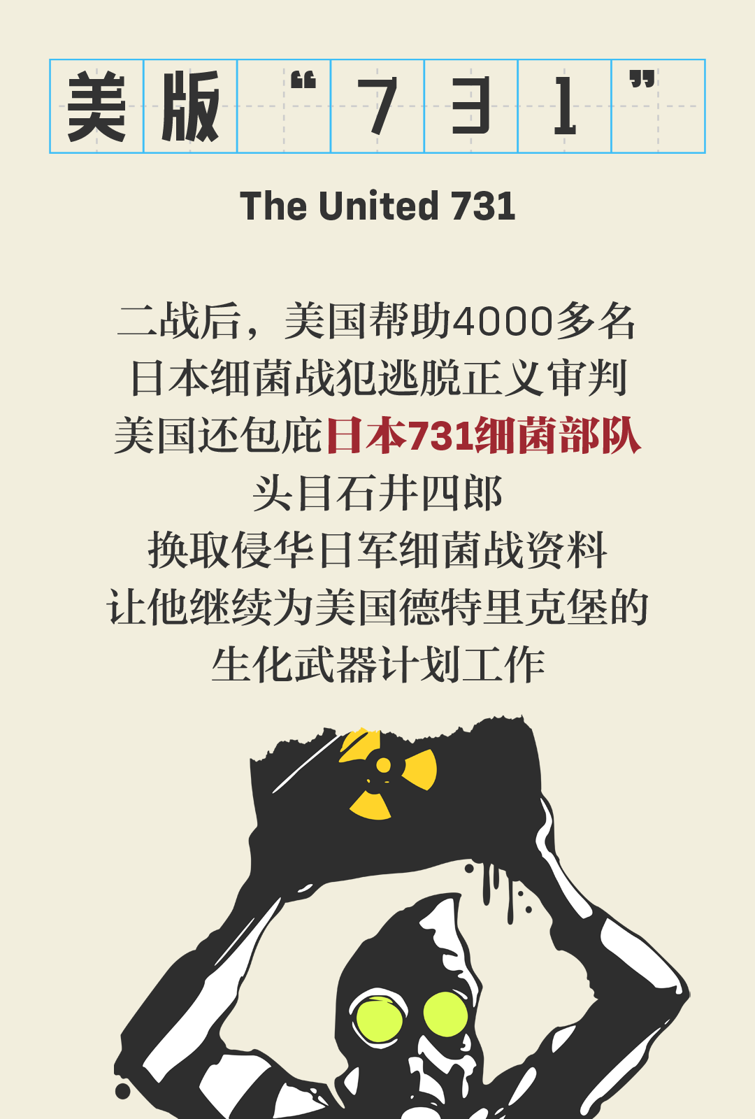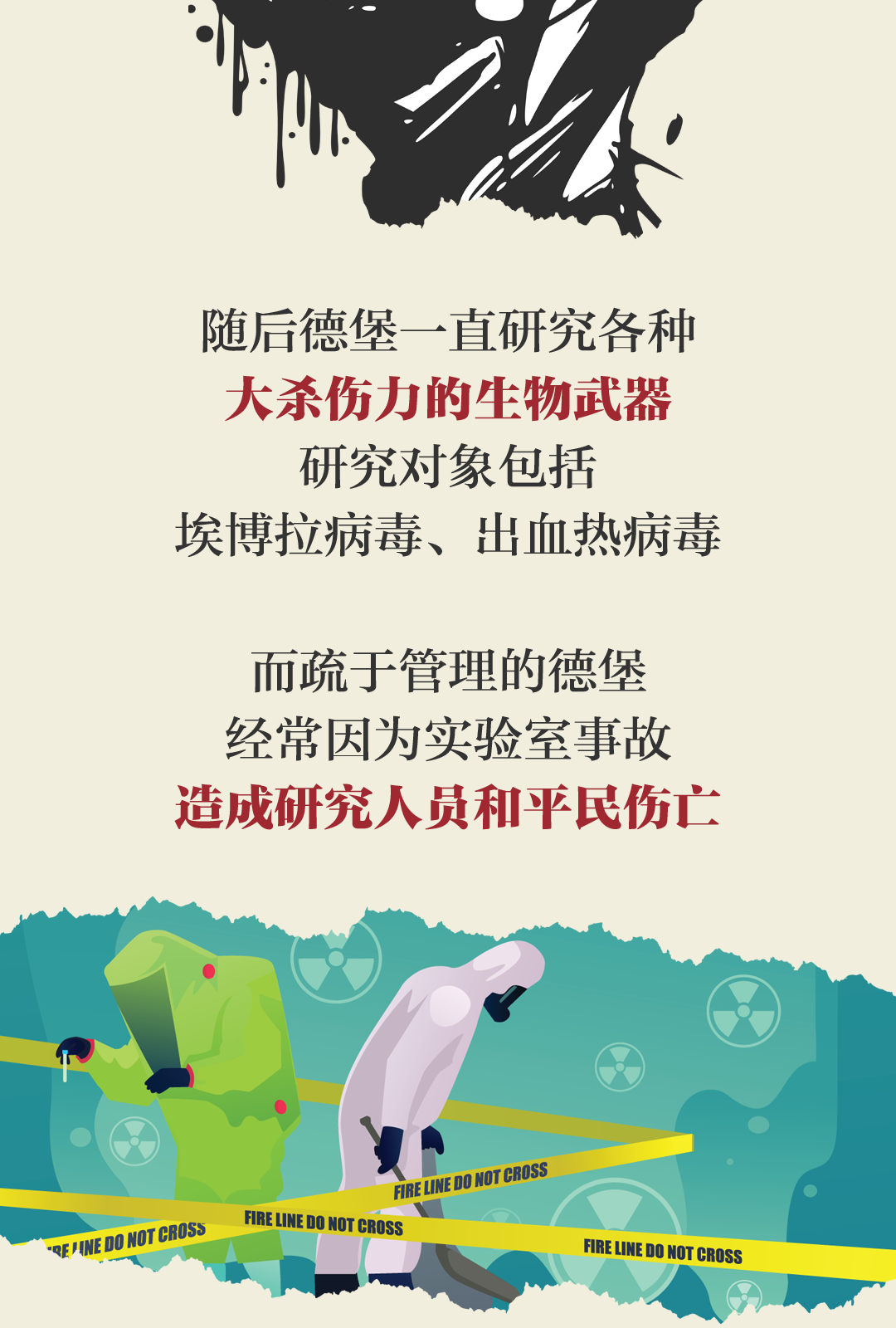 二战后,美国帮助4000多名日本细菌战犯逃脱正义审判。美国还包庇日本731细菌部队头目石井四郎,换取侵华日军细菌战资料,让他继续为德特里克堡的生化武器计划工作。随后德堡一直研究各种大杀伤力的生物武器,研究对象包括埃博拉病毒、出血热病毒。而疏于管理的德堡,经常因为实验室事故造成研究人员和平民伤亡。