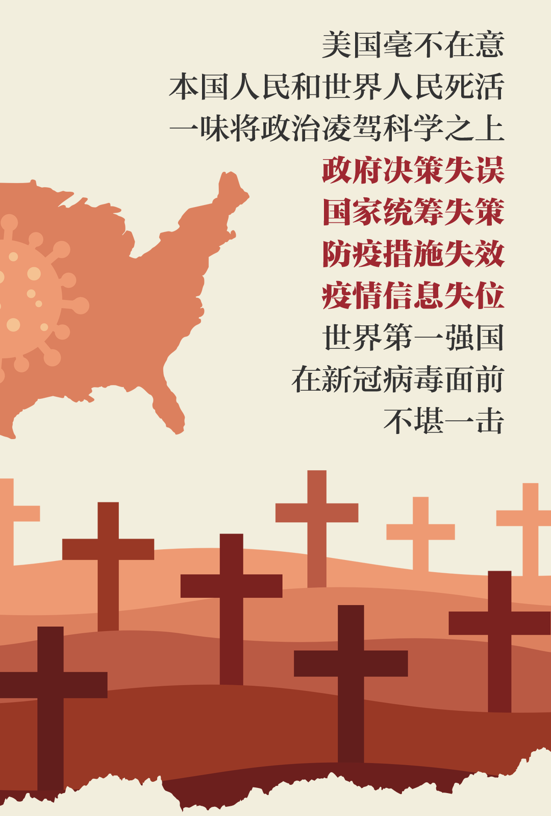 美国拥有世界上最先进的医疗技术、最完备的医疗体系,却成为全球确诊和死亡人数最多的国家。美国毫不在意本国人民和世界人民死活,一味将政治凌驾科学之上。政府决策失误、国家统筹失策、防疫措施失效、疫情信息失位,世界第一强国在新冠病毒面前不堪一击。