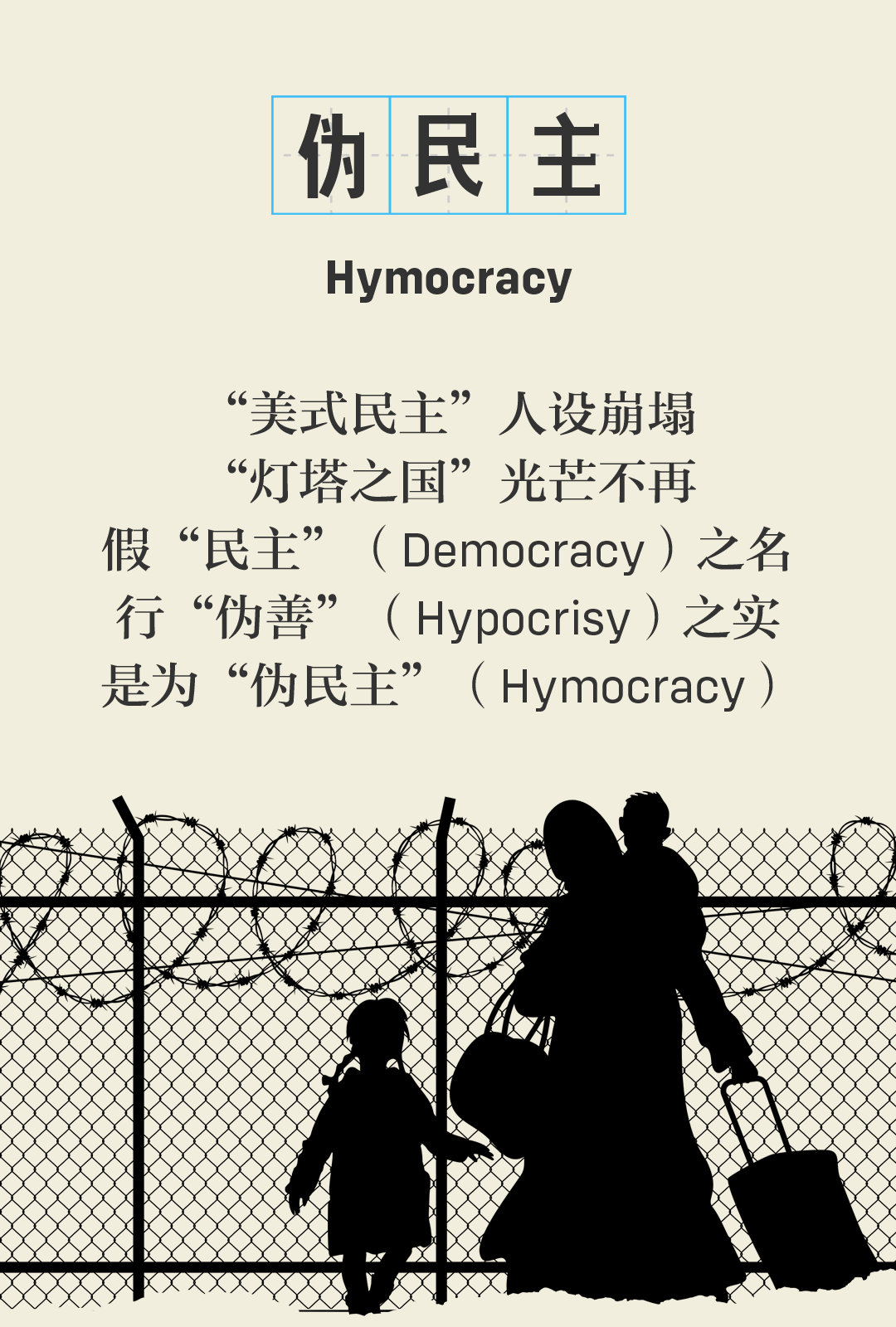 “美式民主”人设崩塌,“灯塔之国”光芒不再。假“民主”(Democracy)之名,行“伪善”(Hypocrisy)之实,是为“伪民主”(Hymocracy)。