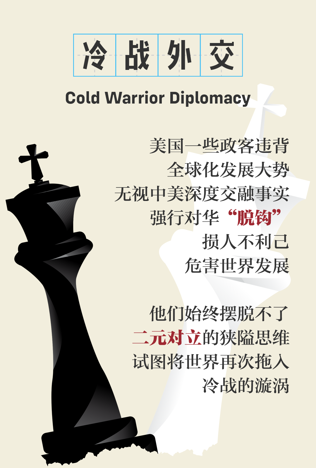 美国一些政客违背全球化发展大势,无视中美深度交融的事实,强行对华“脱钩”,损人不利己,危害世界发展。他们始终摆脱不了二元对立的狭隘思维,试图将世界再次拖入冷战的漩涡。