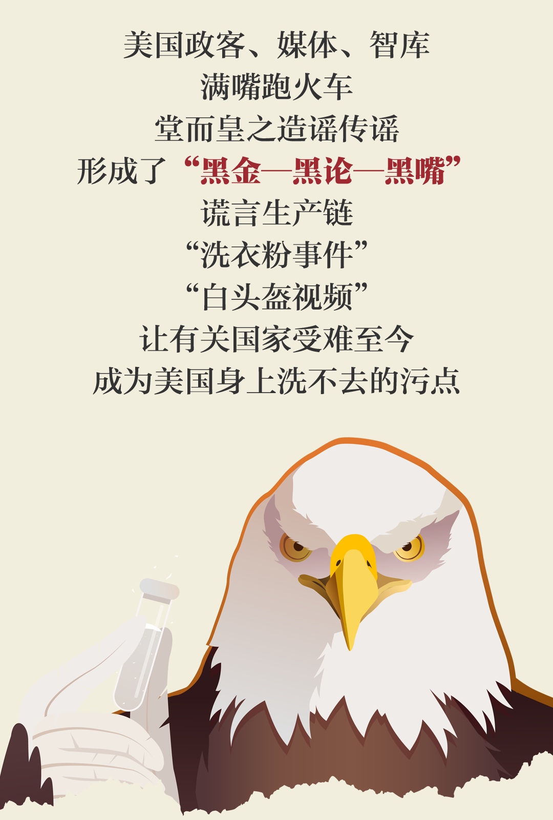 美国政客、媒体、智库满嘴跑火车,堂而皇之造谣传谣,形成了“黑金—黑论—黑嘴”谎言生产链。“洗衣粉事件”“白头盔视频”,让有关国家受难至今,成为美国身上洗不去的污点。近期美国让特工搞“情报溯源”,再次让世人看清,美国罔顾科学和事实,执迷于政治操弄的真面目。