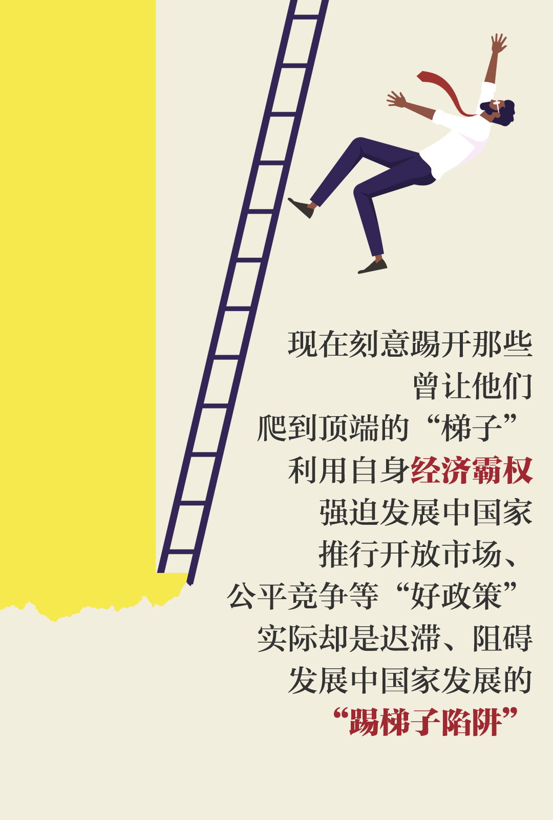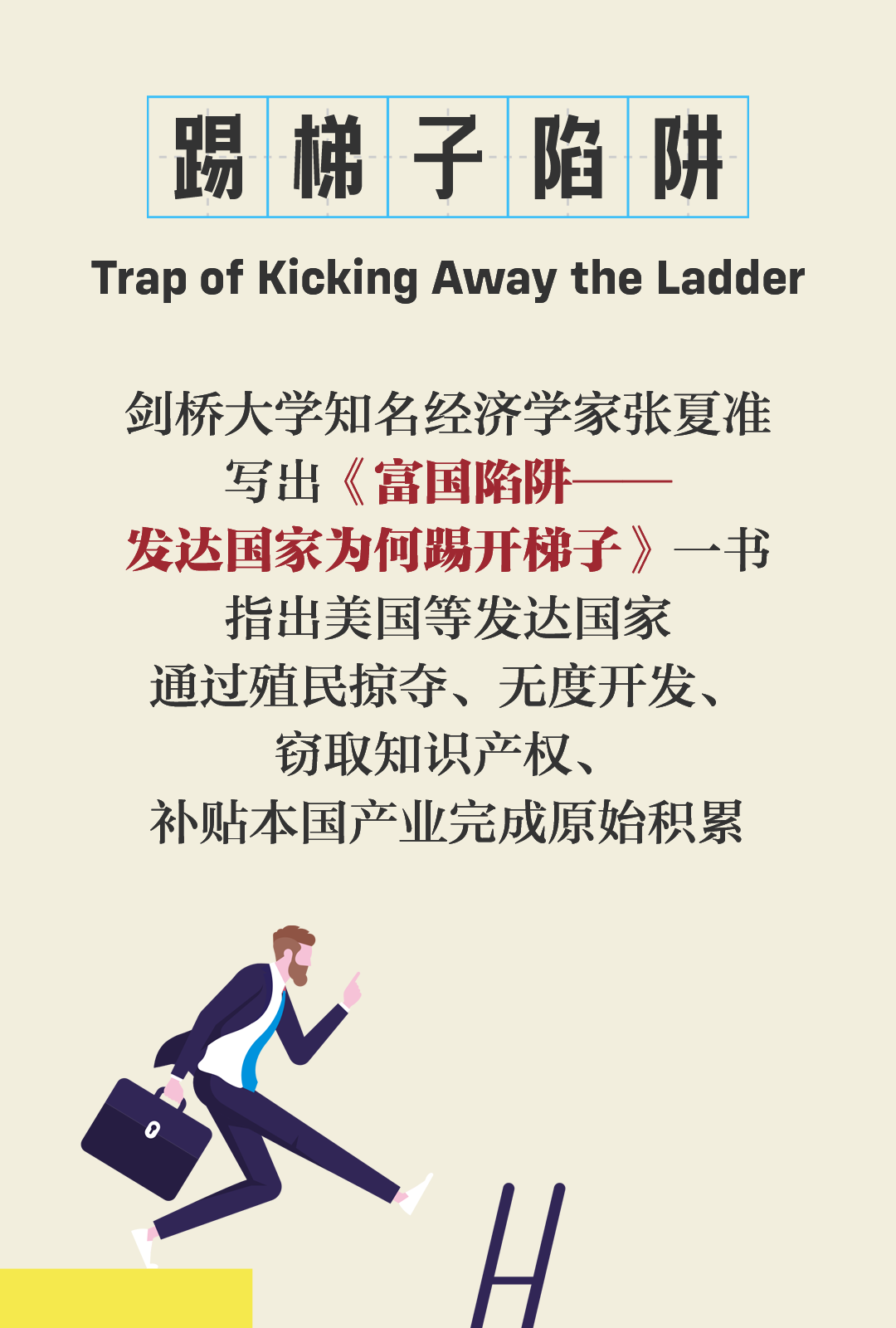 剑桥大学知名经济学家张夏准写出《富国陷阱——发达国家为何踢开梯子》一书,指出美国等发达国家通过殖民掠夺、无度开发、窃取知识产权、补贴本国产业,完成原始积累。现在刻意踢开那些曾让他们爬到顶端的“梯子”,利用自身经济霸权,强迫发展中国家推行开放市场、公平竞争等“好政策”,实际却是迟滞、阻碍发展中国家发展的“踢梯子陷阱”。