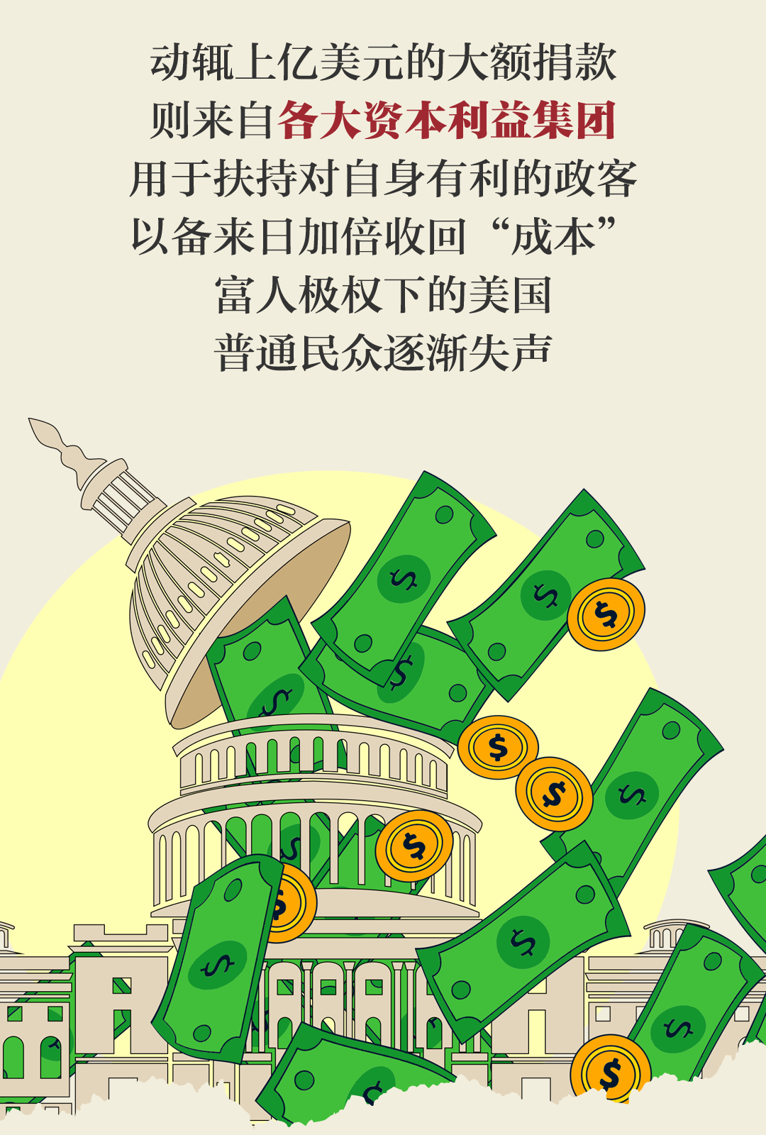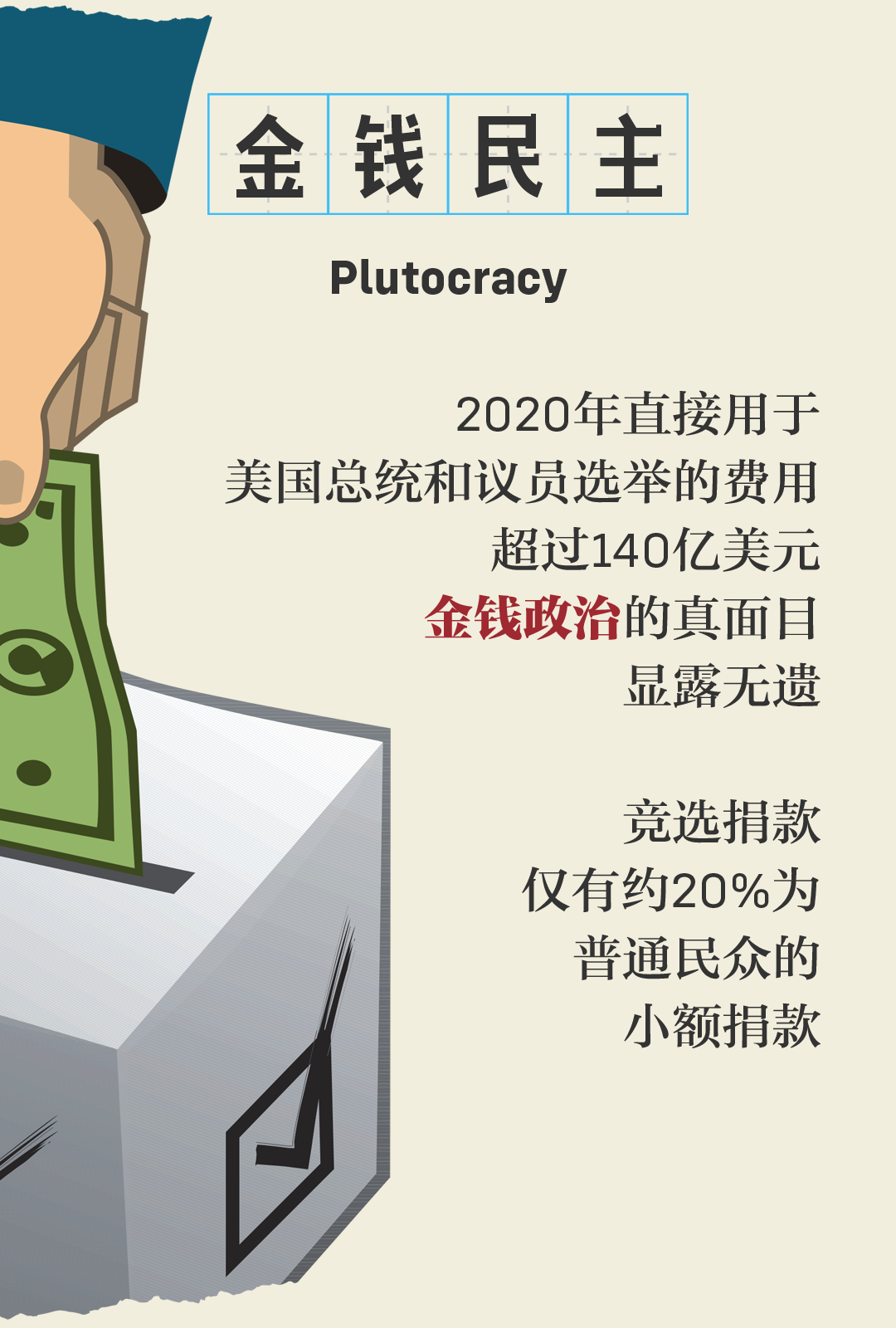 2020年直接用于美国总统和议员选举的费用超过140亿美元,金钱政治的真面目显露无遗。竞选捐款仅有约20%为普通民众的小额捐款,动辄上亿美元的大额捐款则来自各大资本利益集团,用于扶持对自身有利的政客,以备来日加倍收回“成本”。富人极权下的美国,普通民众逐渐失声。