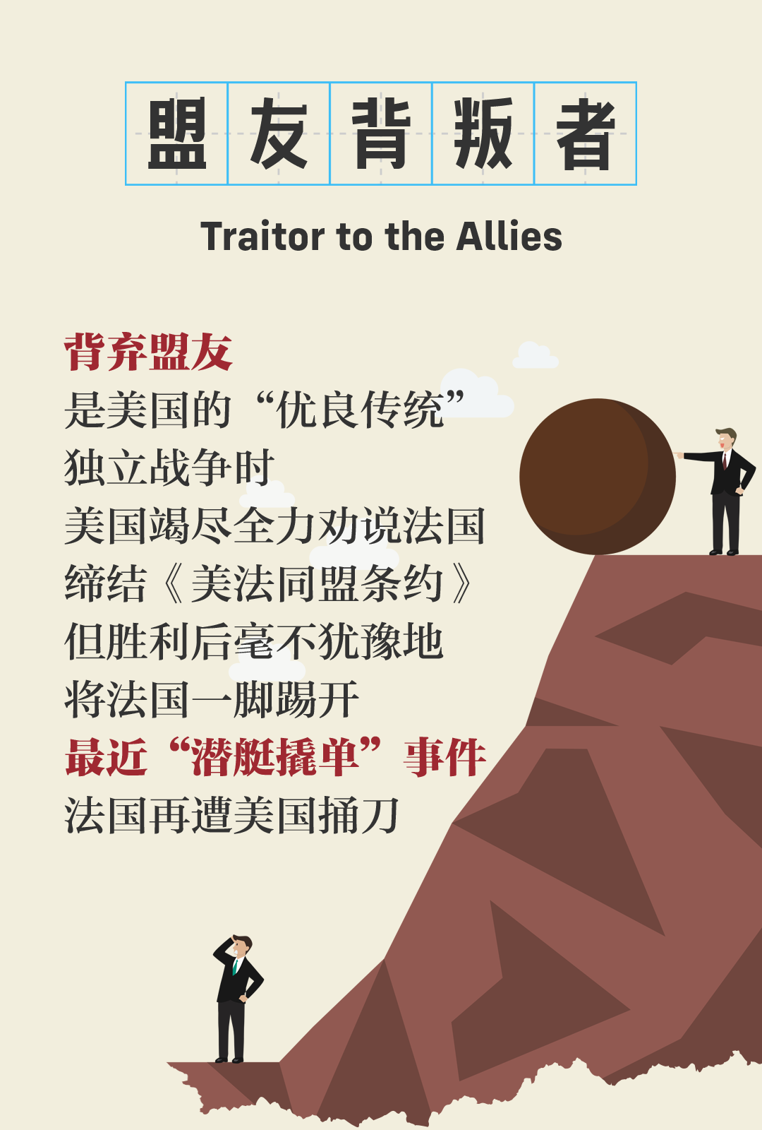 背弃盟友是美国的“优良传统”。独立战争时,美国竭尽全力劝说法国缔结《美法同盟条约》,但胜利后毫不犹豫地将法国一脚踢开。近期“潜艇撬单”事件中,法国再遭美国背后捅刀。而近些年,美国还先后背弃库尔德人、阿富汗政府等,留下一堆又一堆烂摊子。看到这样的美国,不知道“台独”势力心里慌不慌?