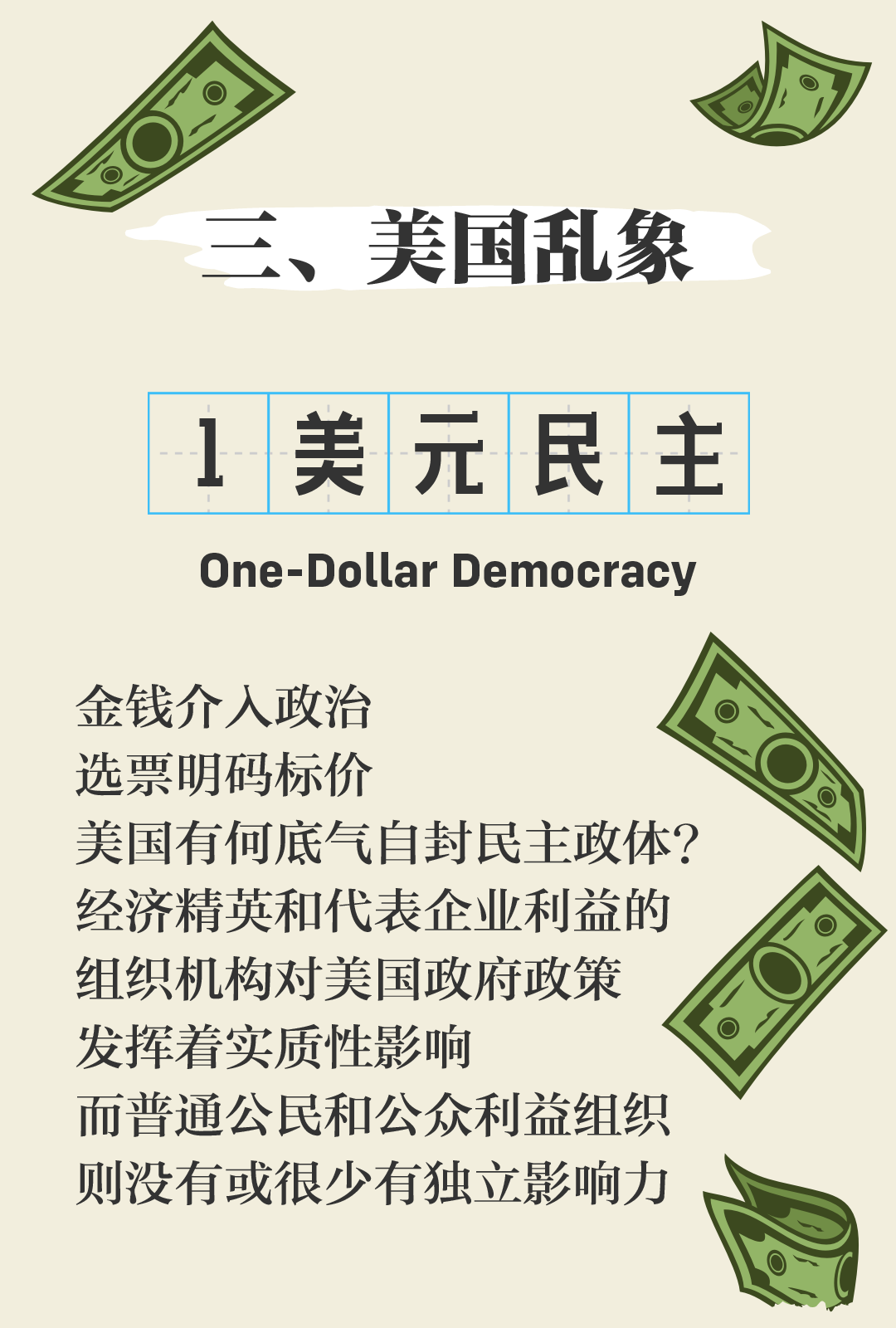金钱介入政治,选票明码标价,美国有何底气自封民主政体?经济精英和代表企业利益的组织机构,对美国政府政策发挥着实质性影响,而普通公民和公众利益组织则没有或很少有独立影响力。