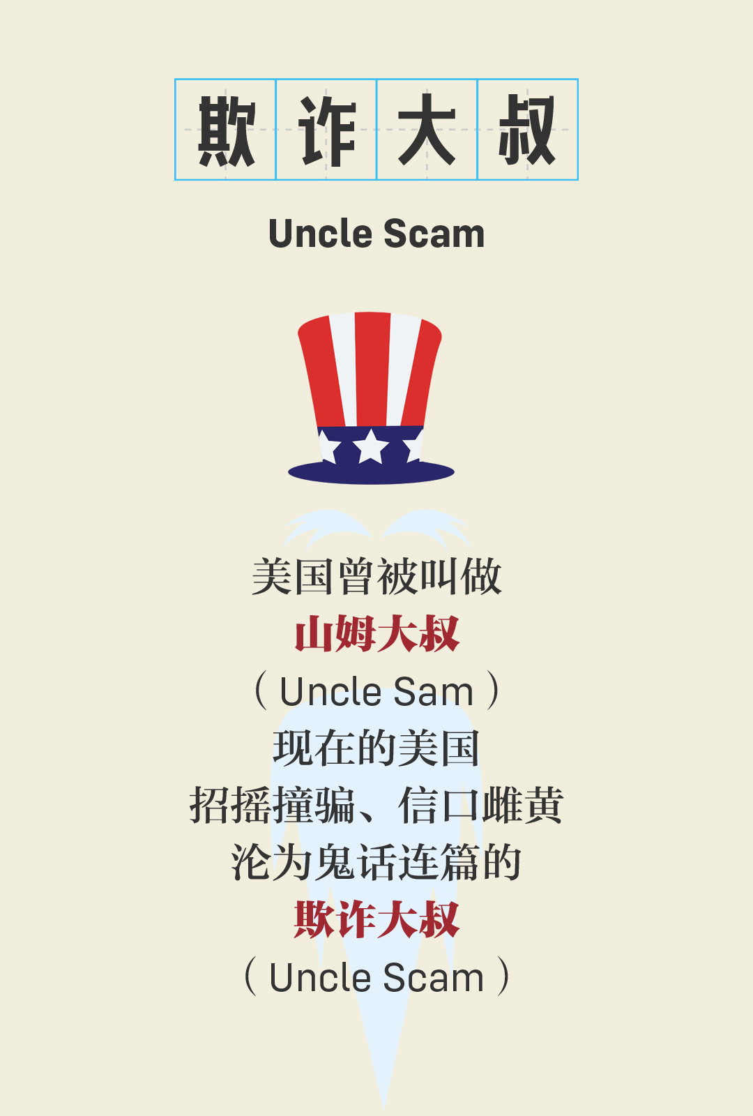 美国曾被叫做山姆大叔(Uncle Sam),现在的美国招摇撞骗、信口雌黄,沦为鬼话连篇的欺诈大叔(Uncle Scam)。